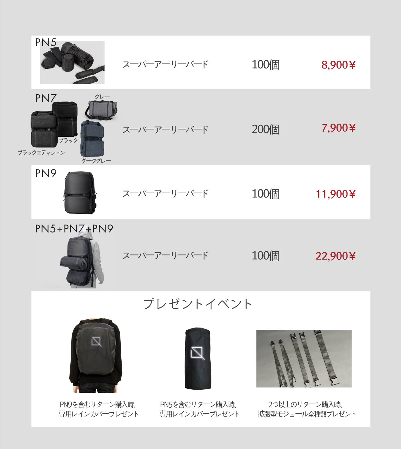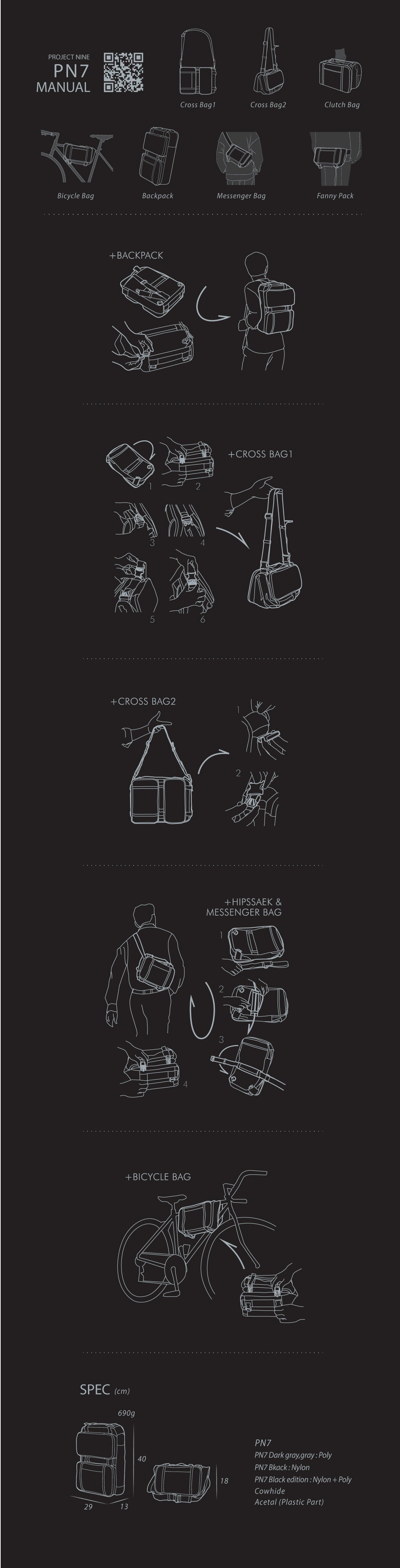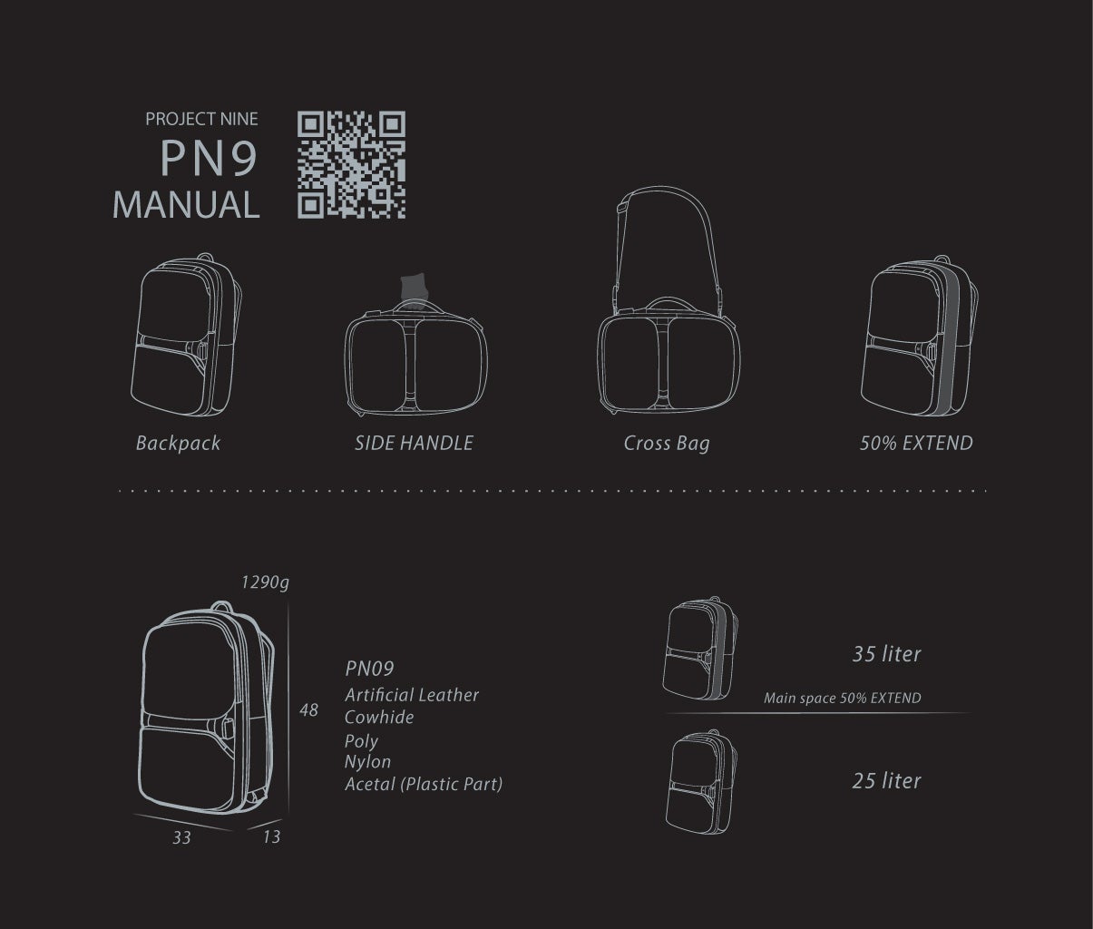PN9:「PROJECT NINE」(PN)のすべてのバッグを入れることができ、旅行時の容量拡張や肩ベルトの収納など、様々な機能があります。