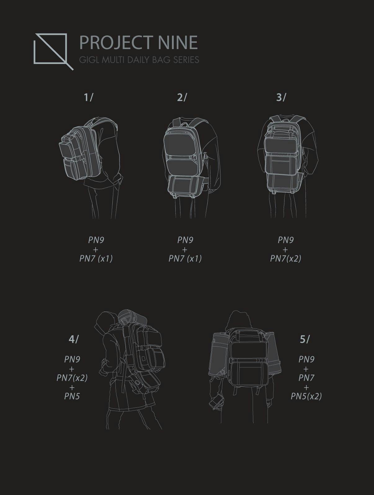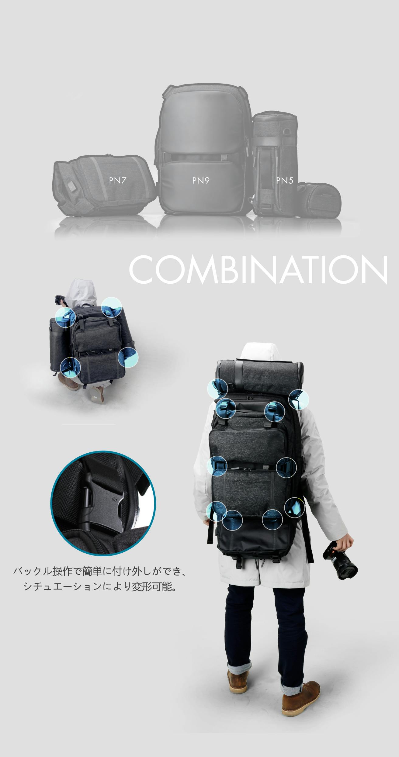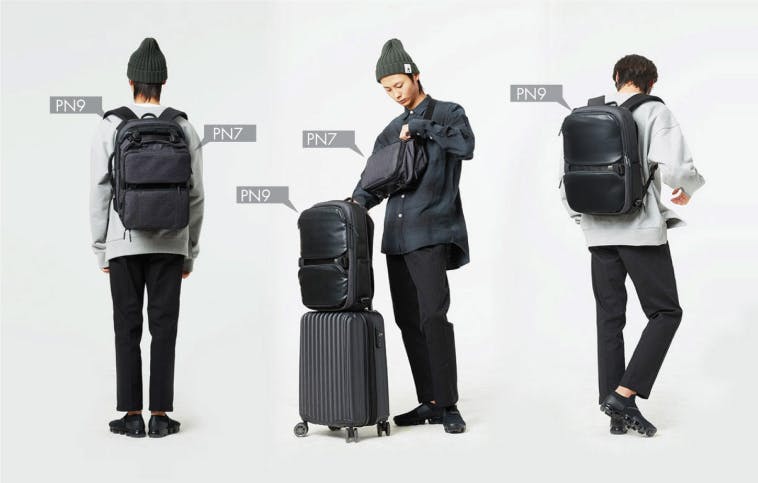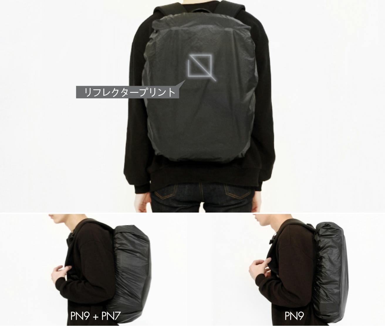 PN9:「PROJECT NINE」(PN)のすべてのバッグを入れることができ、旅行時の容量拡張や肩ベルトの収納など、様々な機能があります。
