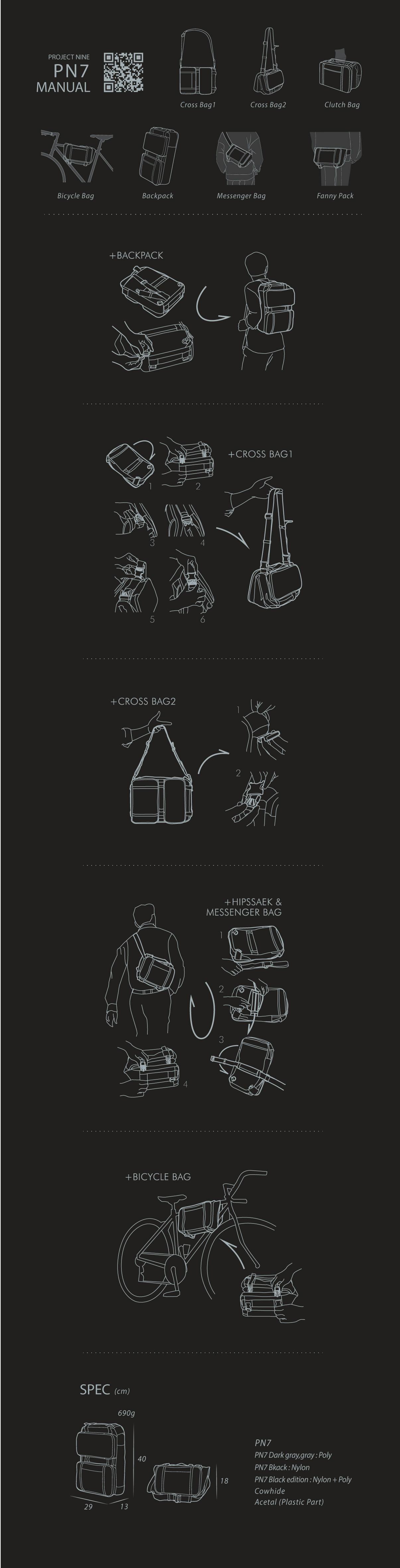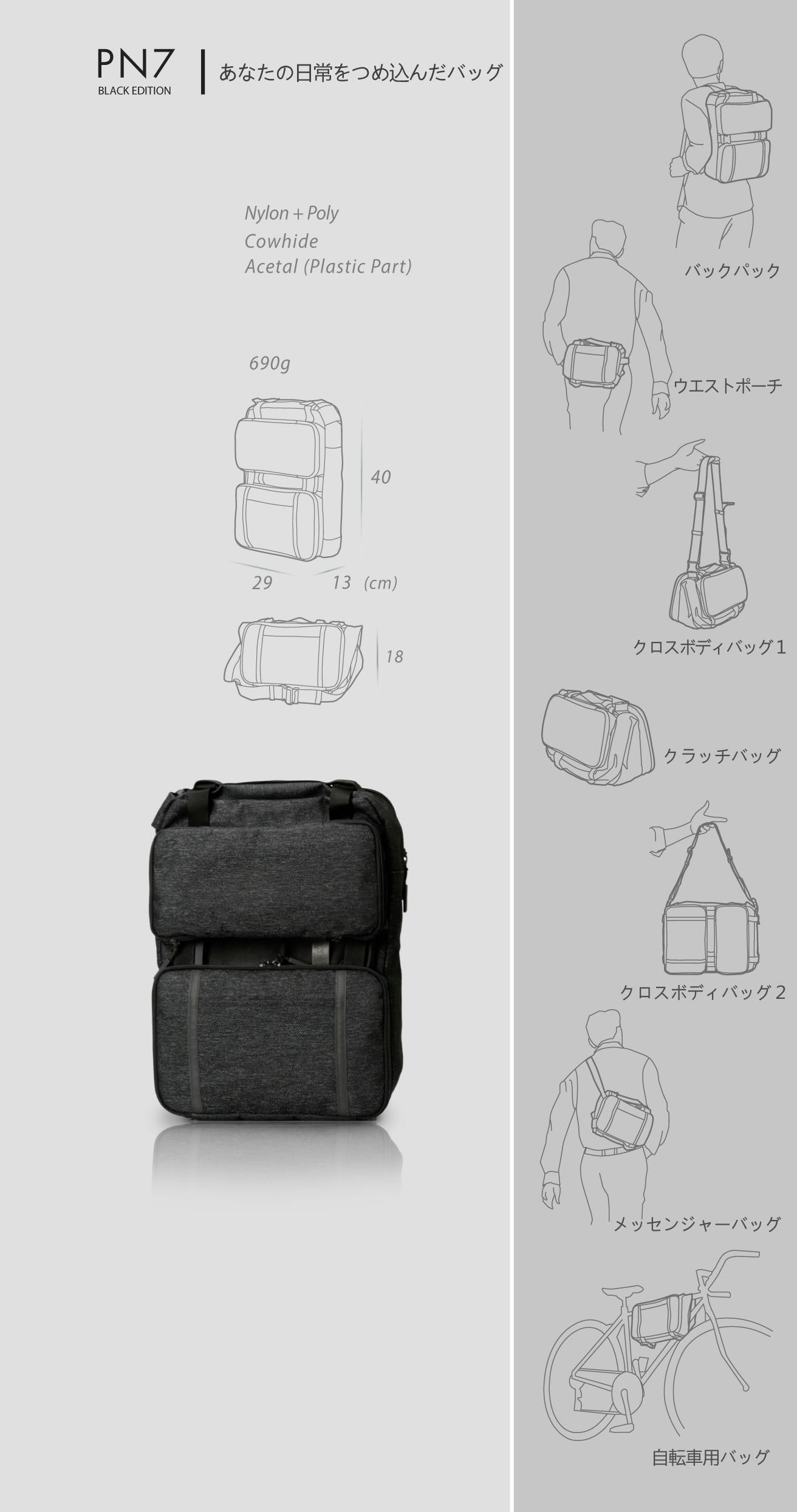 PN7:自転車用バッグからバックパックまで7種のバッグとして使用でき、ユーザーの使用シチュエーションに応じて変身します。