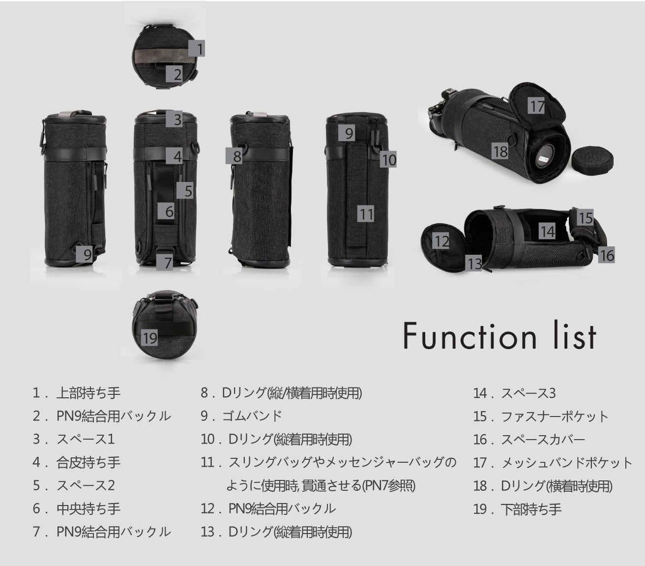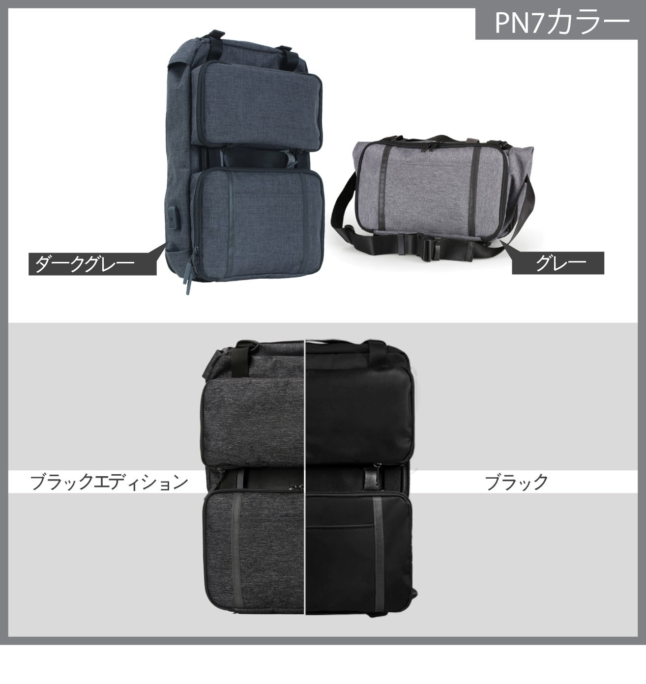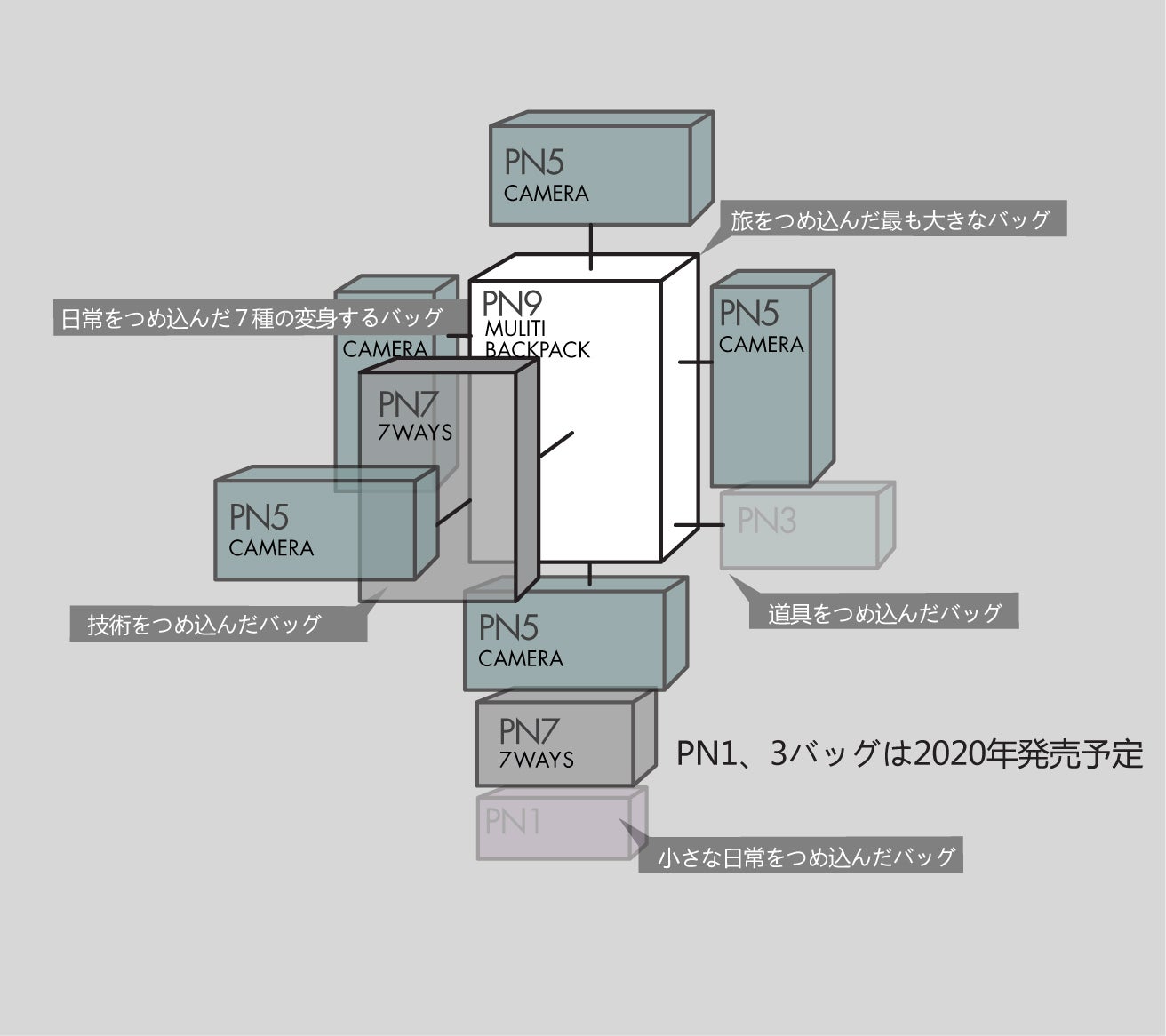 PN9:「PROJECT NINE」(PN)のすべてのバッグを入れることができ、旅行時の容量拡張や肩ベルトの収納など、様々な機能があります。