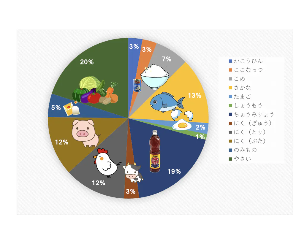 グラフにしてみると「調味料」「飲み物」の値段の高さがかなり気になりました。でも、初回だということもあり、ある程度は仕方がないとの考えもあります。