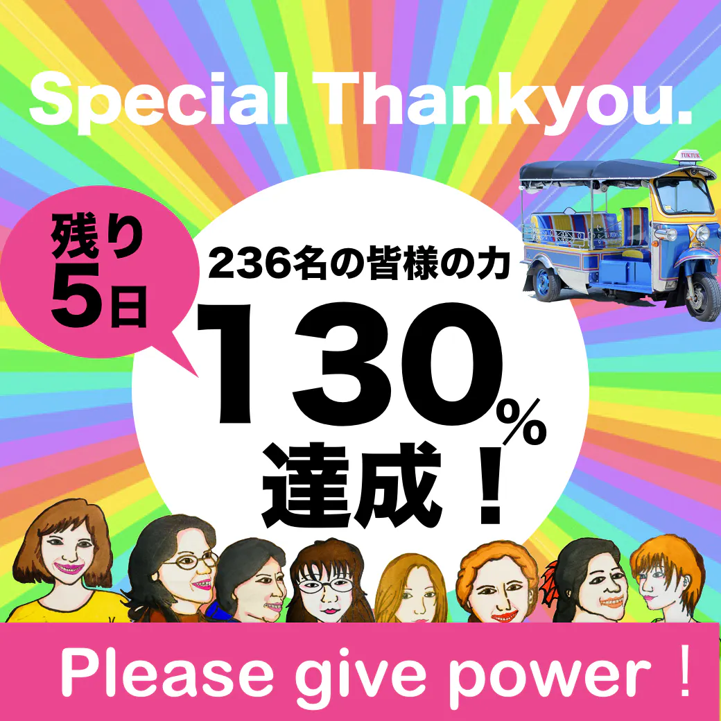 私達の大切なみなさん以上に、まだお会いしたこともない方々これからお会いする方々まで、遠くに遠くに声が届くほど、共感が生まれれば生まれるほどこの大きな夢は叶う可能性があります。今の130%だって236名もの方々の共感が積み重なりここまでの力になりました。