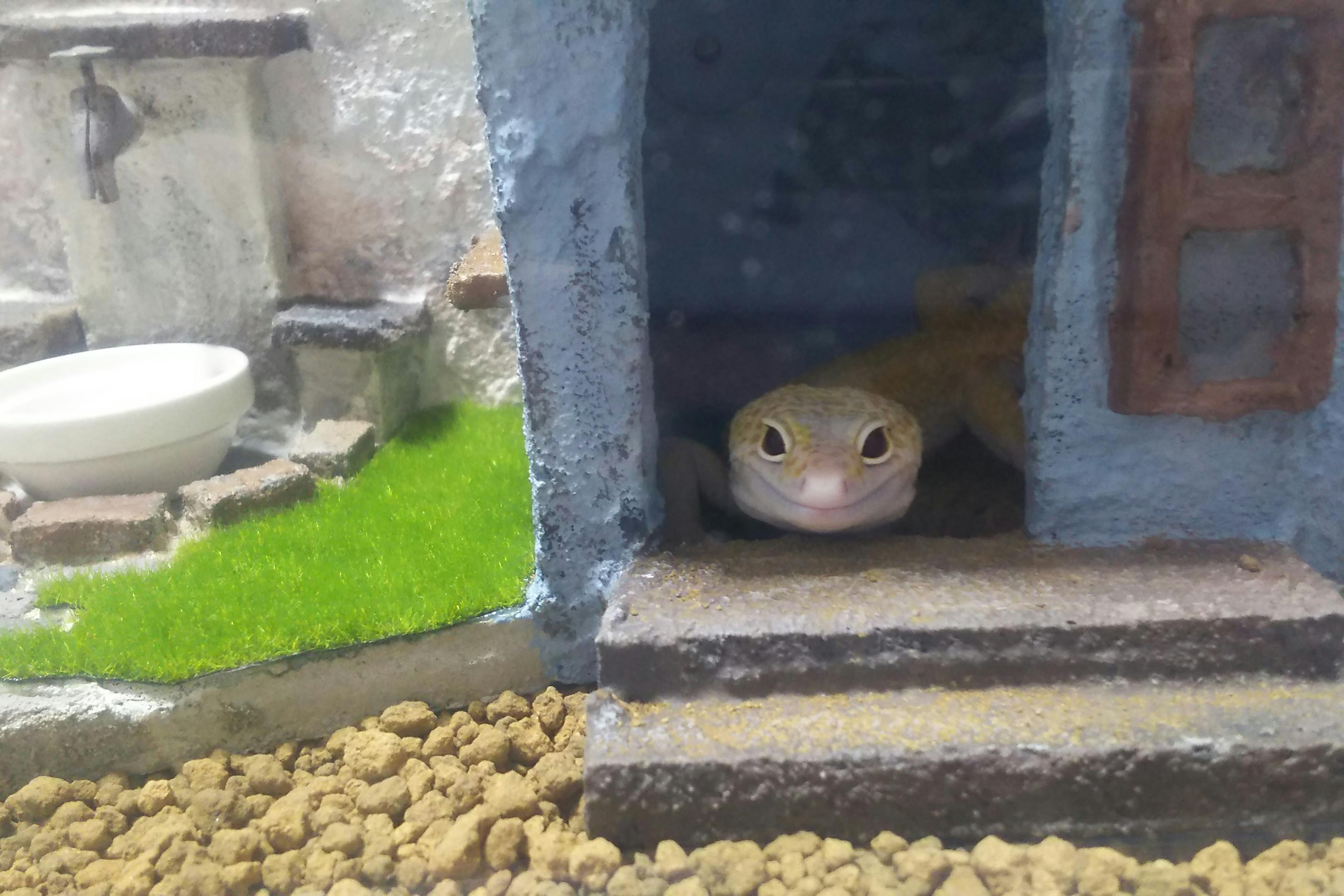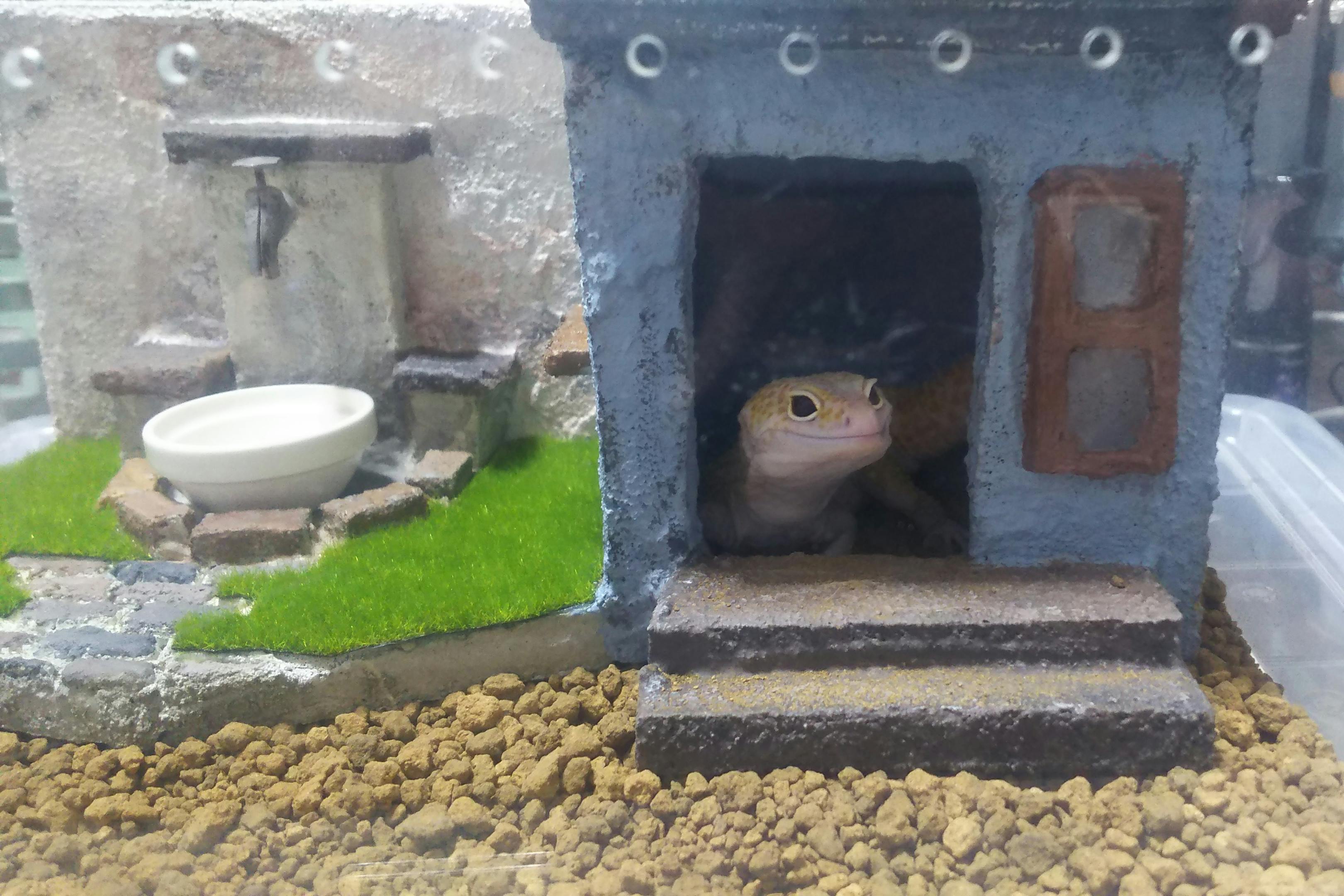 まるでドールハウスのように愛らしいシェルター(レオパのおうち)は、レオパの魅力をいっそう引き立ててくれます。つい写真を撮ってしまいたくなるような、「インスタ映え」度。