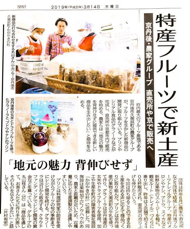 2019/03/16 13:29久美浜の美味しいフルーツを食べながら、こういうフルーツを使ったプリンやグラノーラ作れないかな?とふと思ったのが去年の秋のこと。それから、いろんな人にアドバイスをもらったり力を貸してもらって、それが実現する一歩手前まで来てる気がする!新聞にも書いてもらってるけど、ほんと、背伸びせずに、無理せず、地元のいいものを素直に表現した商品ができたらいいな!背伸びや無理をせずにこうして物事が進んでいるのも、本当にいろんな人の支えがあるから!クラウドファンディングで応援してくれる人がいるのも、ものすごく支えになっています!(一人でやってたら、絶対に無理して頑張りすぎちゃうから・・・)本当にありがとうございます! もっと見る