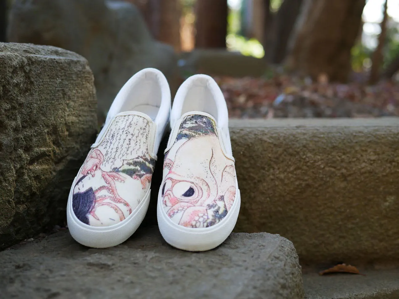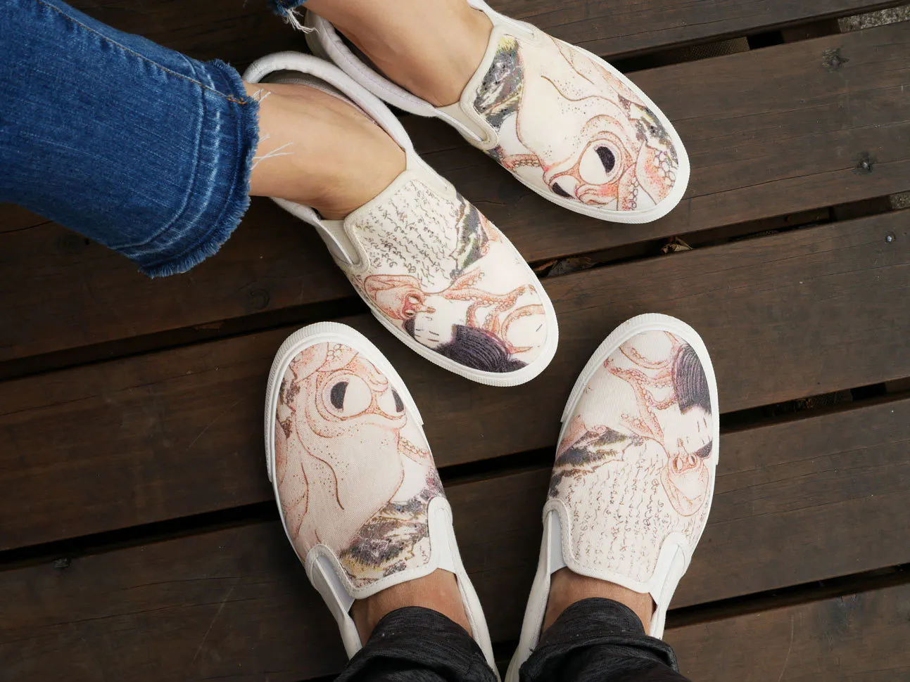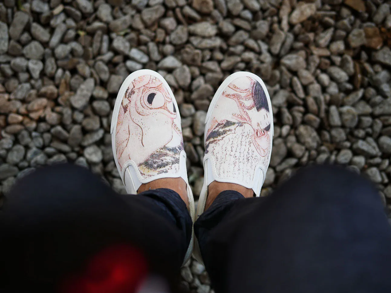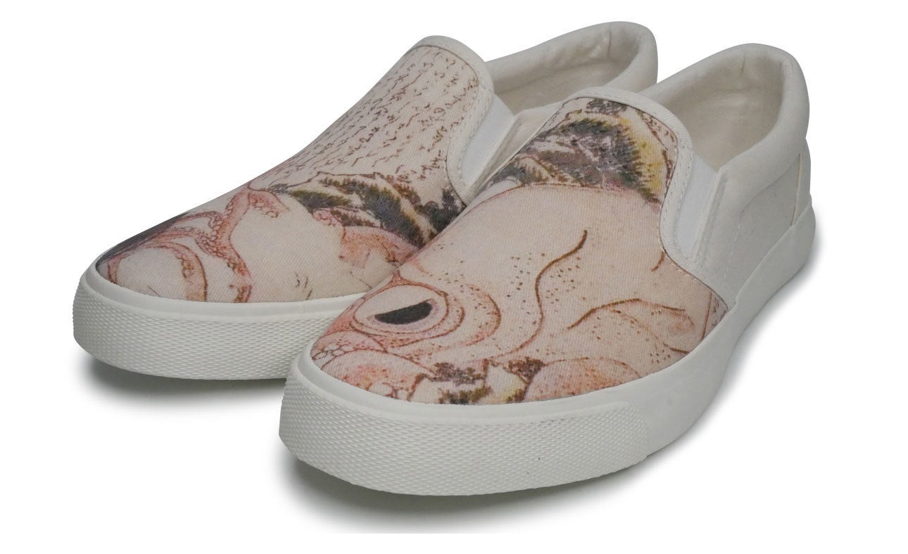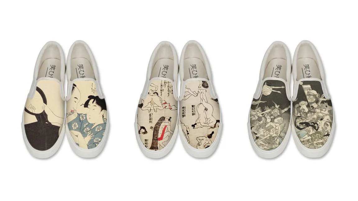 春画の良さを知ってもらうために、身につけるもの(服やアクセサリーなど)を作りたいと思いました。ただ、春画をモチーフにした服などは、目にしたことがあり、新鮮味に欠けます。靴であれば、プリントでの表現もある程度でき、春画独特の "敢えて見せない" 艶っぽさも表現できると考えたからです。「わぁ、その靴どこで買ったの?」「これ、誰が書いたの?」といった会話が生まれればサイコーです。