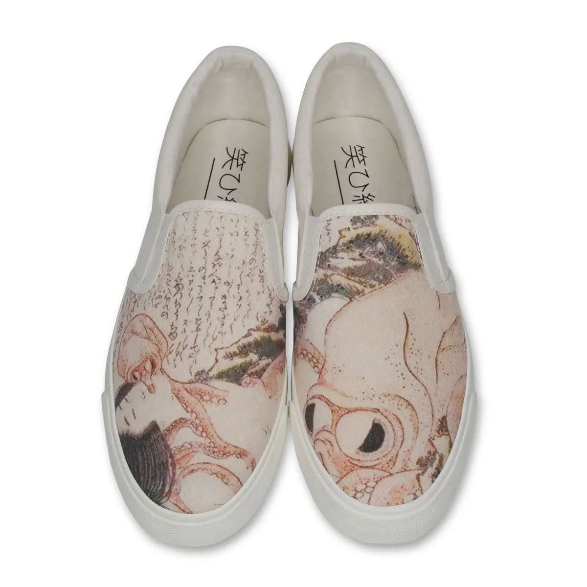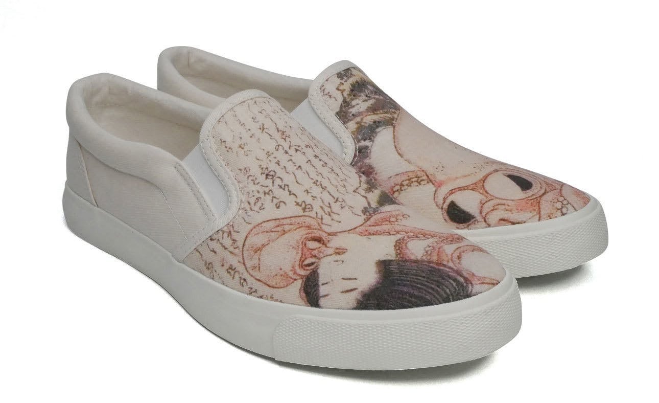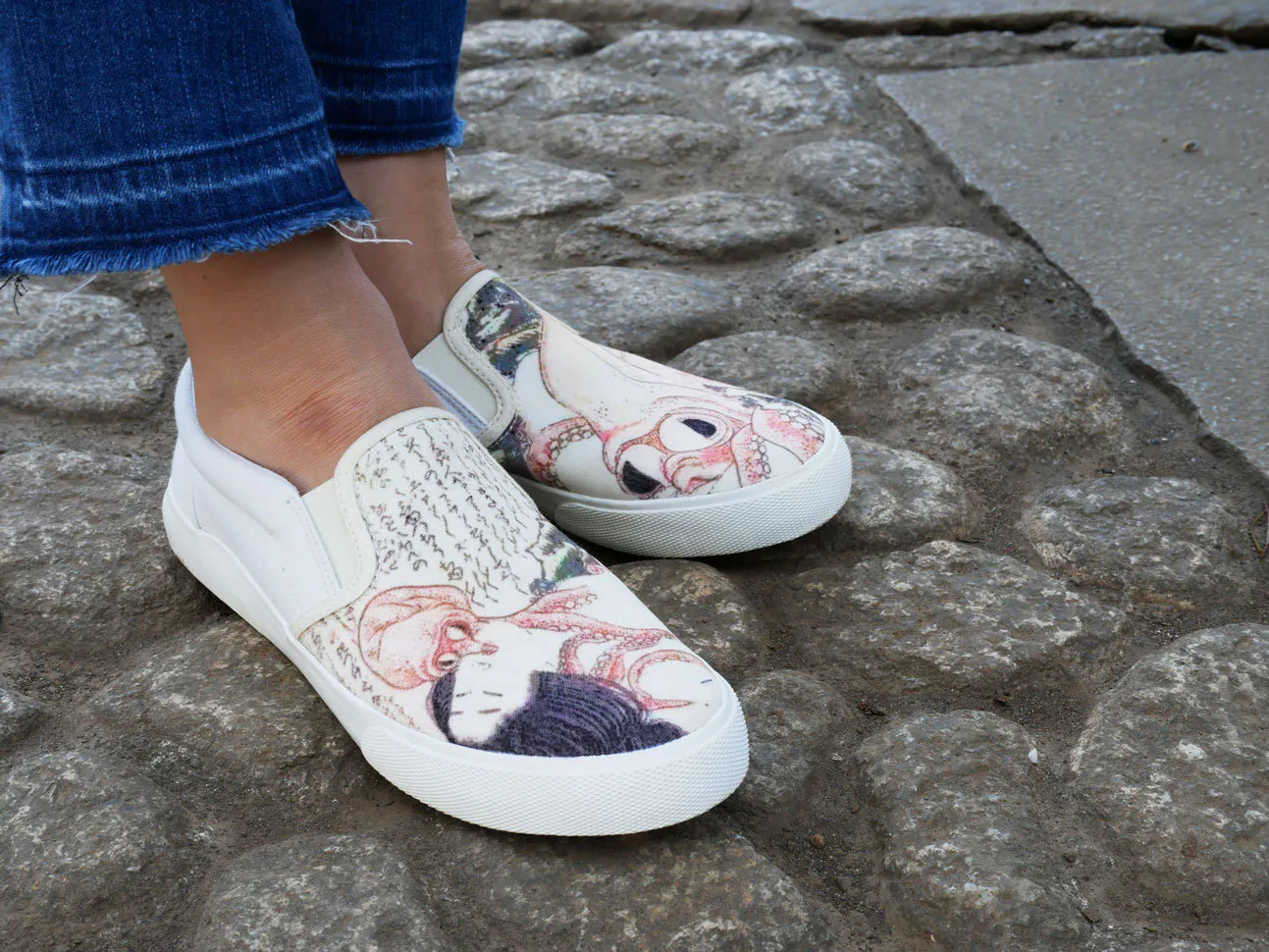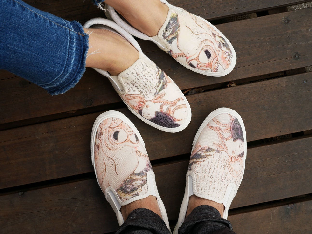 春画の良さを知ってもらうために、身につけるもの(服やアクセサリーなど)を作りたいと思いました。ただ、春画をモチーフにした服などは、目にしたことがあり、新鮮味に欠けます。靴であれば、プリントでの表現もある程度でき、春画独特の "敢えて見せない" 艶っぽさも表現できると考えたからです。「わぁ、その靴どこで買ったの?」「これ、誰が書いたの?」といった会話が生まれればサイコーです。