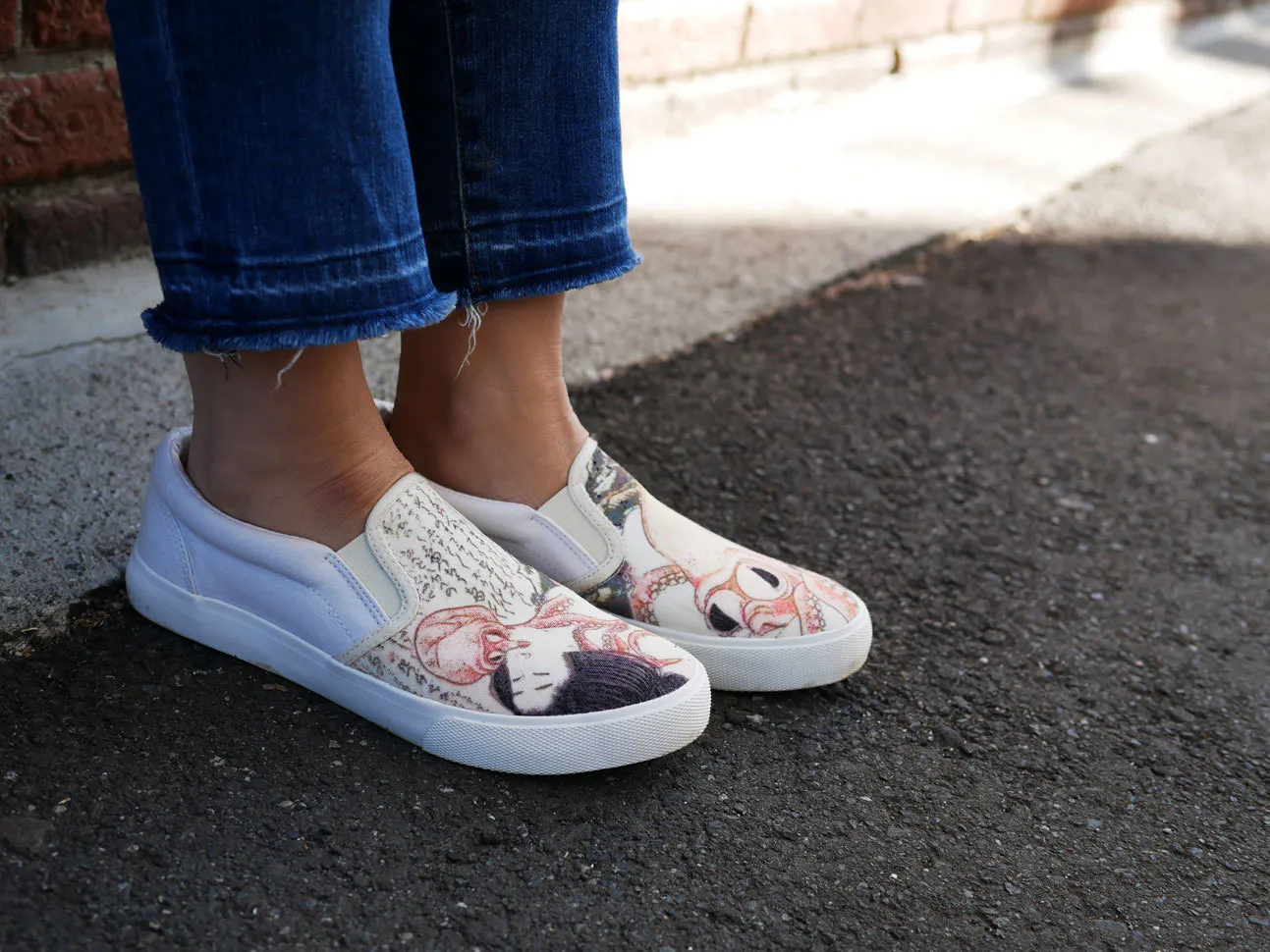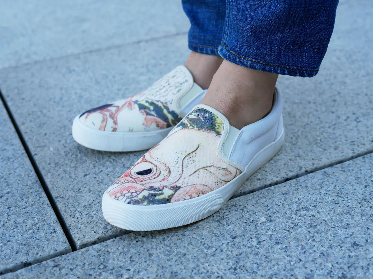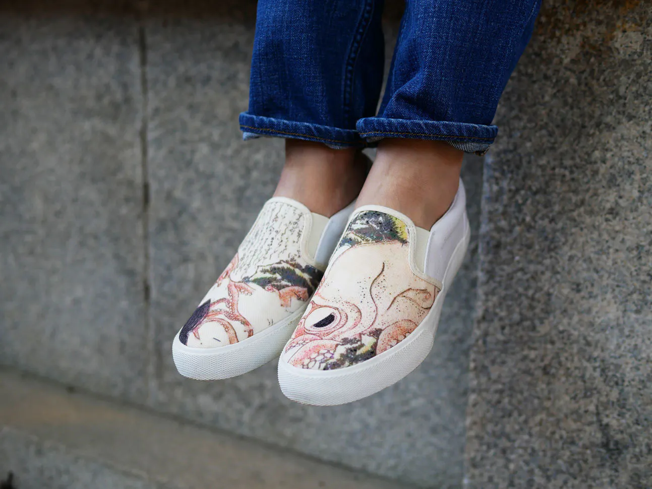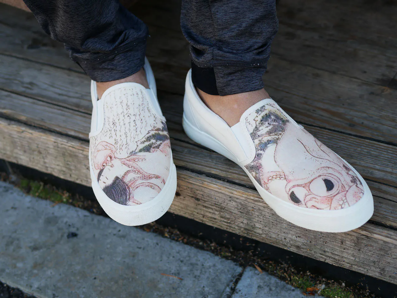 春画の良さを知ってもらうために、身につけるもの(服やアクセサリーなど)を作りたいと思いました。ただ、春画をモチーフにした服などは、目にしたことがあり、新鮮味に欠けます。靴であれば、プリントでの表現もある程度でき、春画独特の "敢えて見せない" 艶っぽさも表現できると考えたからです。「わぁ、その靴どこで買ったの?」「これ、誰が書いたの?」といった会話が生まれればサイコーです。
