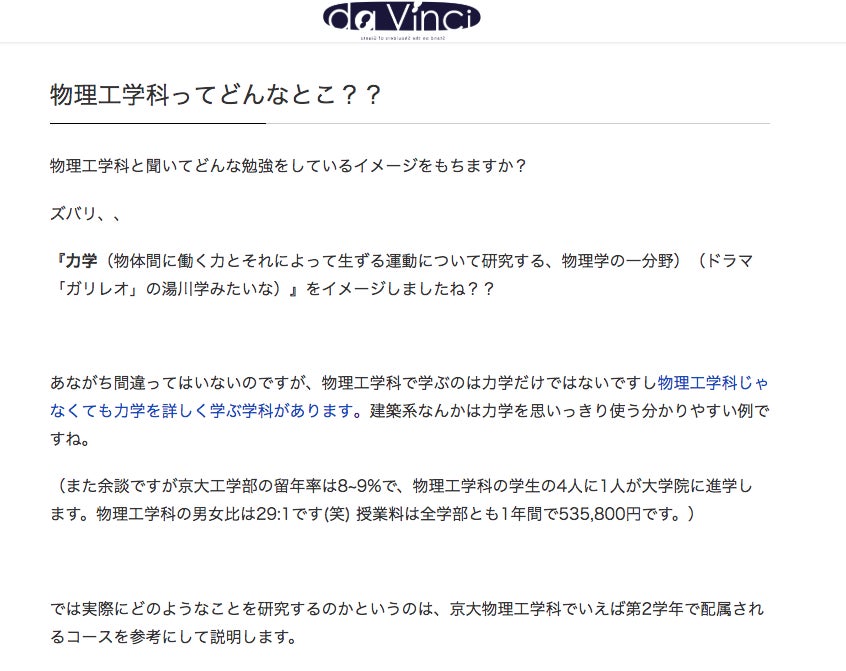 そこで da Vinci は勉強のサポートだけではなく、大学選びにも重点を置いて活動していきます。具体的には、現役大学生が自分の通っている大学学部学科について記事を書いたり、大学選びのセミナーを開きます。
