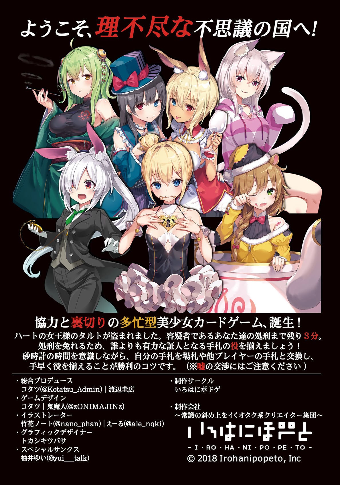 アナログゲーム制作サークル「いろはにボドゲ」は、2018年6月に立ち上げたばかりの新米サークルです。当サークルでの処女作「不思議の国のアリス~理不尽な女王裁判~」は、正直に申し上げると、非常に参りました。1年間の制作予定期間を半年に縮められ、全ての制作スケジュールの前提がひっくり返ってからの制作だったからです。