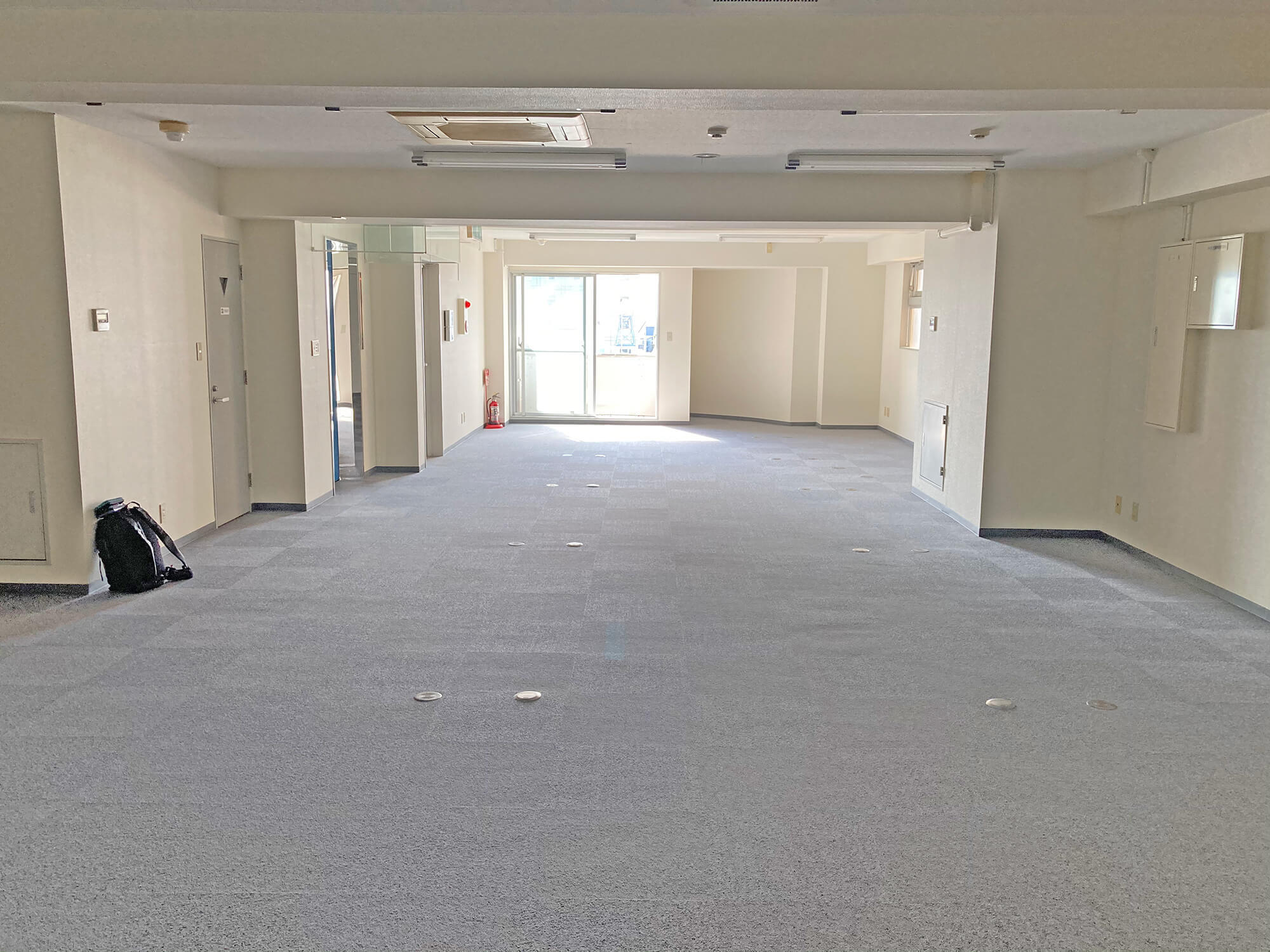 レイアウトは以下のように、中央を横に切り返して共用部(ラウンジスペース)と個室スペース(オフィススペース)を切り分けました。