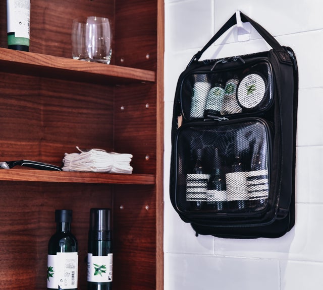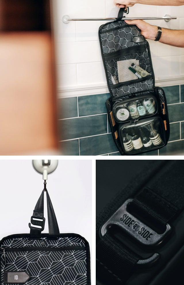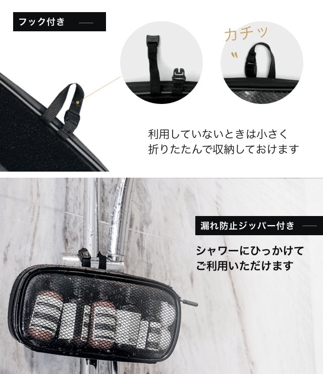 CUBEポーチだけではなく、本体にもフックがついており、ホテルについてすぐに壁にかけて利用することができます。開いてそのまま設置、あるいは側面に壁掛けに利用できるストラップがついています。
