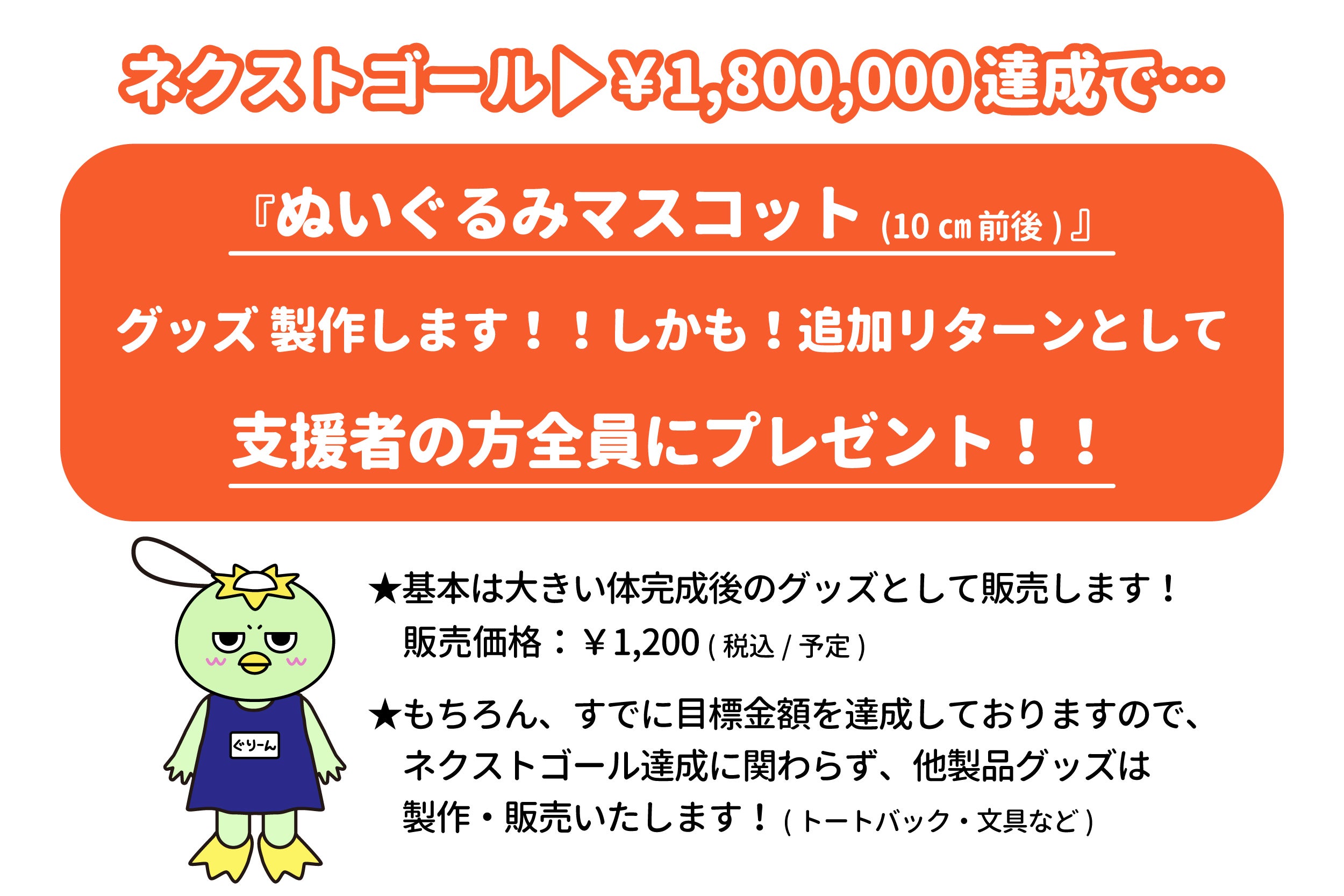 そして目標金額をすで上回っていますので、+αの資金でマスコットとは別の製品グッズは製作・販売いたします!