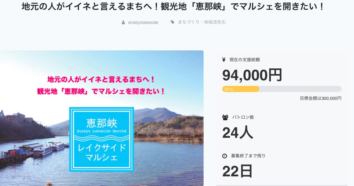 レイクサイドマルシェ実行委員会の古井千景です!クラウドファンディングの開始から2日間が経ち、なんと、なんと…40人もの方に支援していただき、既にプロジェクト達成率は58%に…!SNSでも沢山の方にシェアしていただいて、中には恵那峡についての思いを添えてシェアしてくださる方もいて、自分たちの思いが、こうやって広がって、支えてもらえることに、嬉しさと感謝の気持ちでいっぱいです。そして実は今日、クラウドファンディングのをきっかけとして、チームとしても新たな動きがありました!Twitterでのリツイートを通して私たちのことを知ってくださった方が、こんなツイートを…恵那市出身で、今は岐阜県の別の地域でデザインなどの仕事をしているという有藤さん。「こんなステキな方がいるなんて」と思い、いそいそとプロジェクトとメンバーの紹介資料を作り…今朝さっそくSkypeでミーティングをし…チームに加わってもらえることになりました!実はなんと有藤さん、私と高校も大学も、そして誕生日も同じ!これを運命の出会いと言わずしてなにが運命なのか…と、はやくもワクワクしています◎笑そしてこれも、SNSでシェアしていただいたみなさんのおかげです。2日目にしてかなりパワーアップした実行委員会にぜひご期待ください◎シェア・ご支援、引き続きよろしくお願いします〜!プロジェクトページはこちらから「地元の人がイイネと言えるまちへ!観光地「恵那峡」でマルシェを開きたい!」