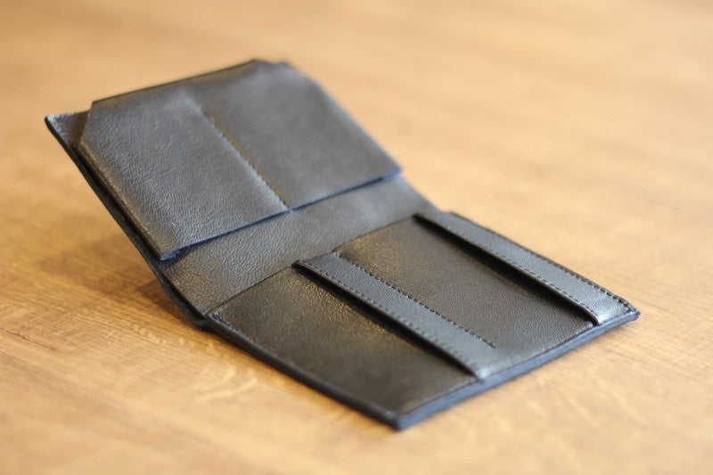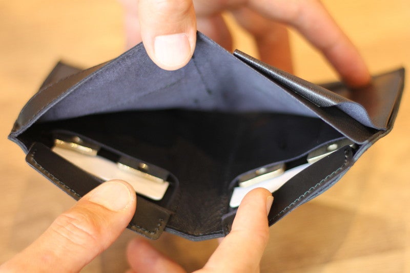 ツインカードスロット ー カード入れを2カ所に分ける事で厚さを分散、でも面積はカード2枚分を並列に並べただけの大きさになっています。カードポケットを折り込み内側から縫製する構造及び山羊革の薄さと伸縮性、強靭さのおかげで実現できました。