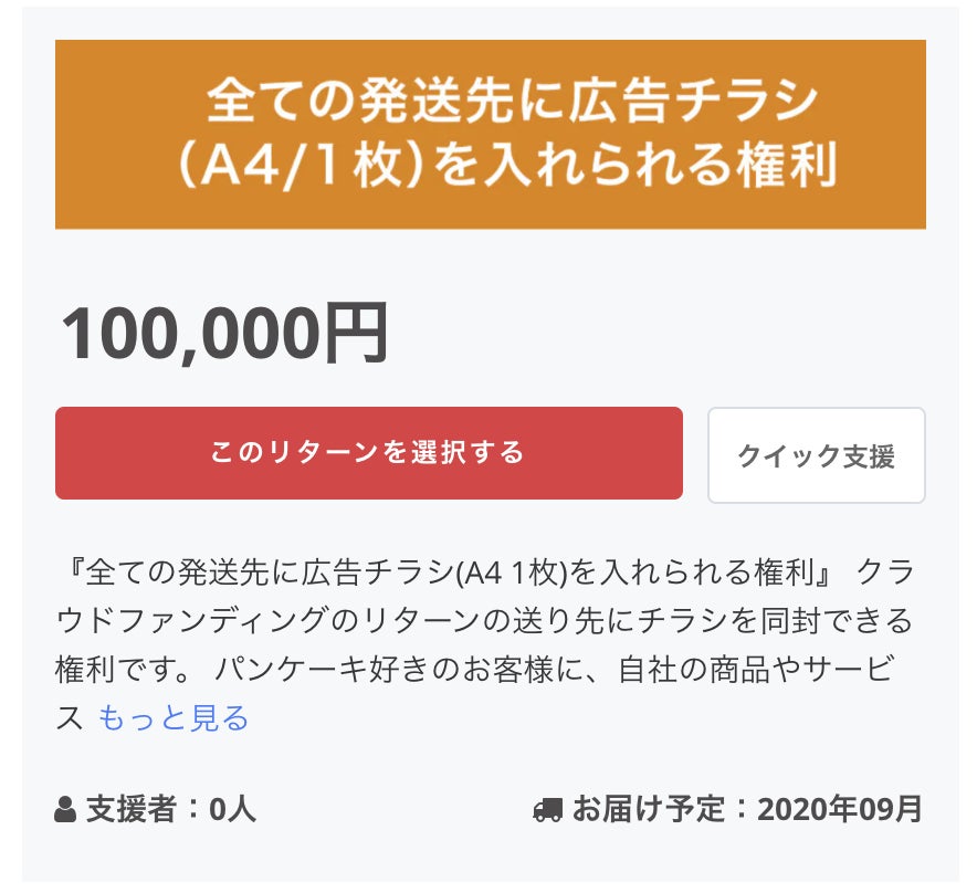 2020/09/20 21:30プロジェクトオーナーの福井です。10万円で広告チラシを入れられるリターンを用意しておりました。しかし、ご覧の通り、支援がありませんでした。そこで、目標金額達成の感謝と、私からのコロナ支援として、本プロジェクトに支援してくださった方限定で、無料で広告チラシを入れられるようにしたいと思います。ぜひ自社の宣伝にご活用ください。条件は下記の通りです。期限:事前申し込みの上、9/27(日)午前までに青森県に必着料金:無料印刷代:ご自身でご負担ください送料:私のところ(青森県)までのチラシの配送費用はご負担ください配送先:約350件サイズ:A4まで。レターパックで配送予定のため、折って入れる可能性もあります。厚みがあるカタログなどは不可。※以下の内容に該当するものはお断りさせていただく場合があります。1)公序良俗に反するもの2)18歳以上を対象としたアダルトコンテンツを含むもの3)犯罪行為に結びつくもの、または違法な内容を含むもの4)第三者の財産・プライバシーを侵害する内容、または第三者への誹謗中傷を含むもの5)選挙の事前運動、選挙運動またはこれらに類似するもの。公職選挙法に抵触する内容を含むもの6)その他不適当であると判断したもの閉じる下記、登録フォームから事前に申し込みをお願いします。https://forms.gle/HCW8ibQUvTPAM96W9後ほど、メールにて配送先をご連絡します。 もっと見る