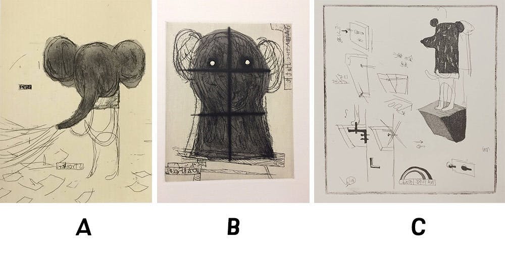 菊池市の旧龍門小学校アーティストスタジオを拠点に、昨年は上海、バーモントでのアーティスト・イン・レジデンスを行うなど、活躍の幅を広げる現代美術家しまうちみかさん。衝動をそのままに作り上げる作品は一見ファニーなようで、残酷さも抱えていて、ひきこまれるものがあります。今回は3種類の銅版画をご提供いただきました。A・B・Cの中から好きなデザインを選んでいただくことができます。(378×287mm 額装込)