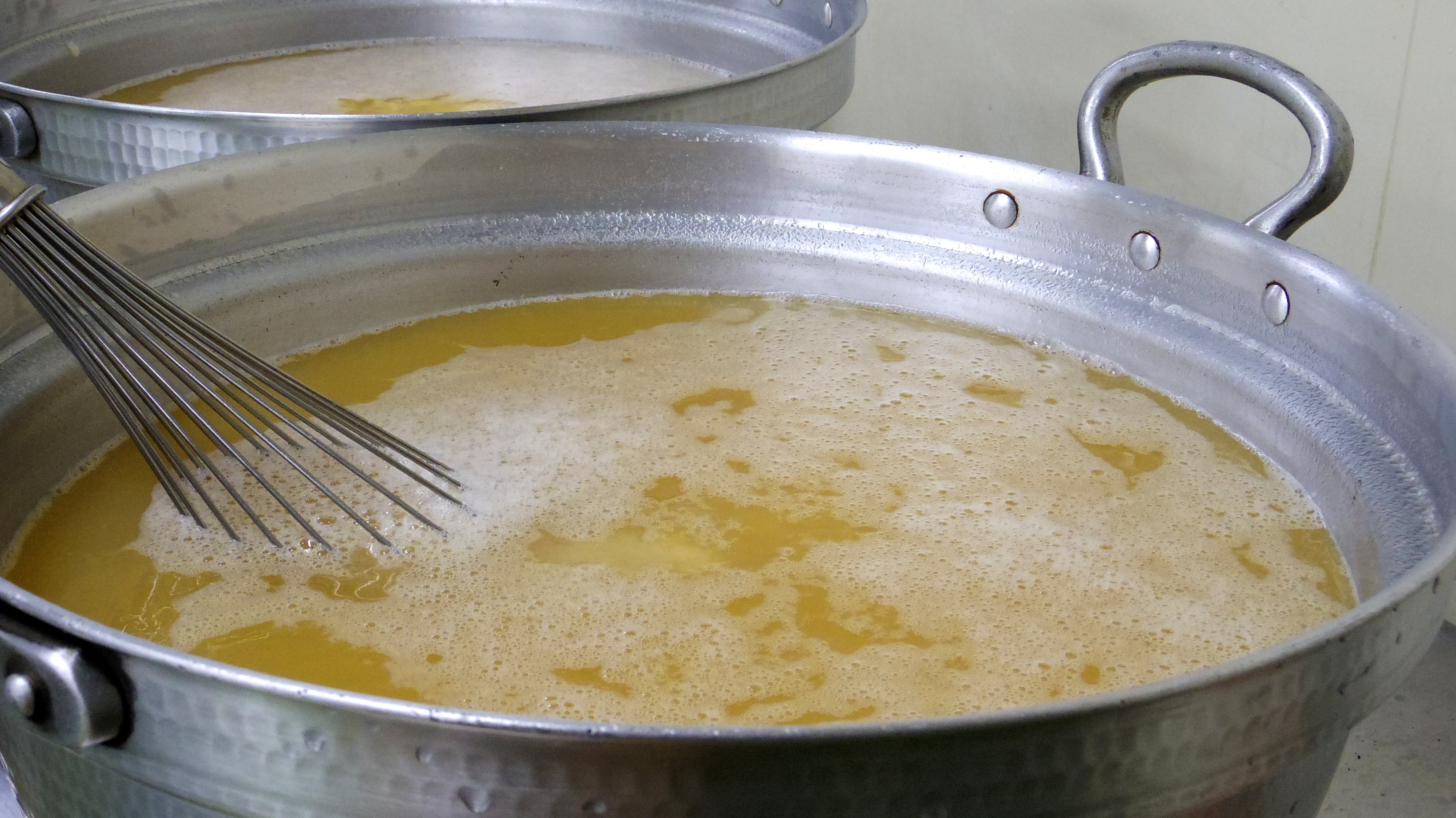 青森県弘前市タムラファーム産の完熟りんご果汁に、その他の原料を混ぜて加熱・攪拌しているところ。