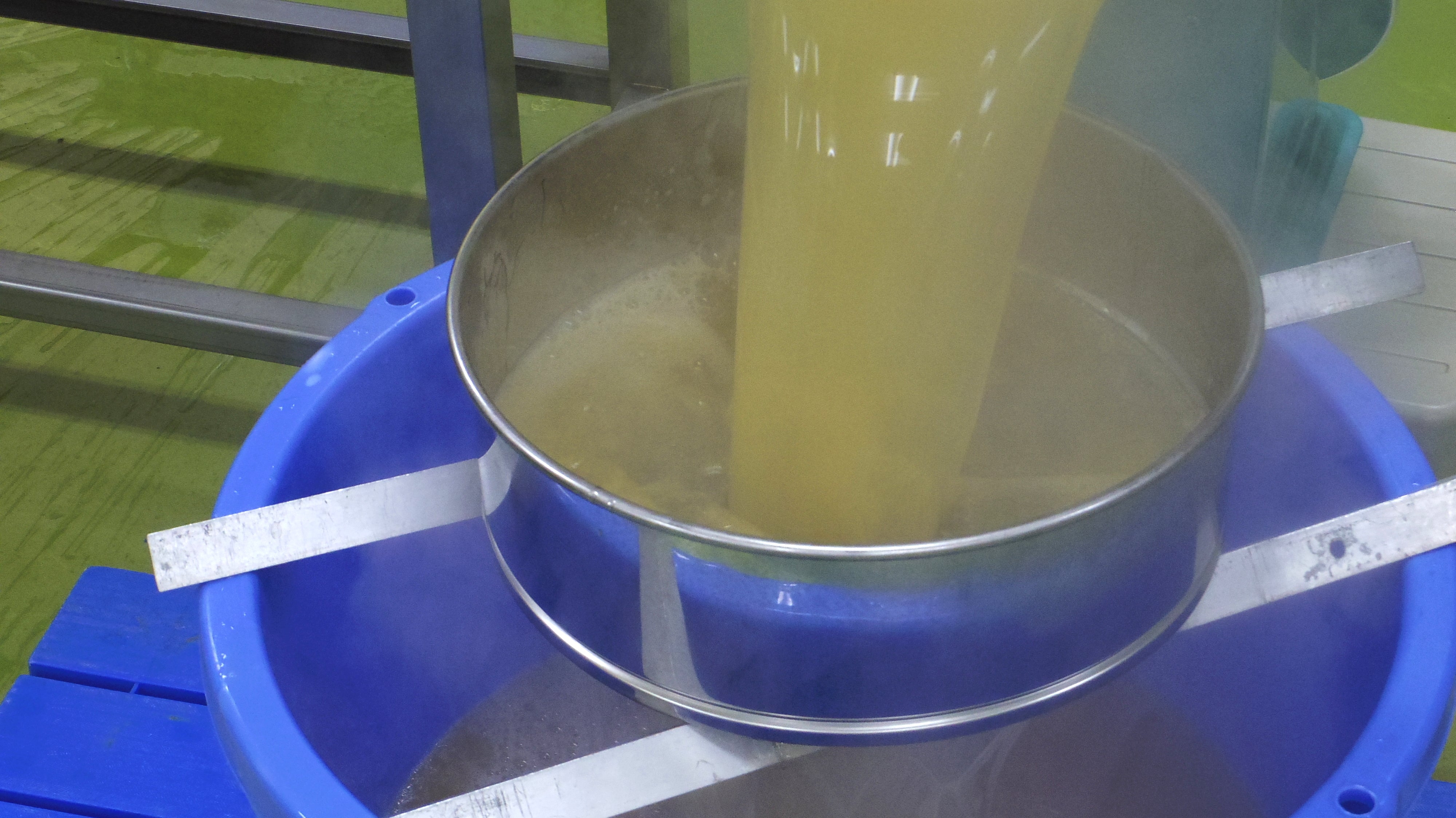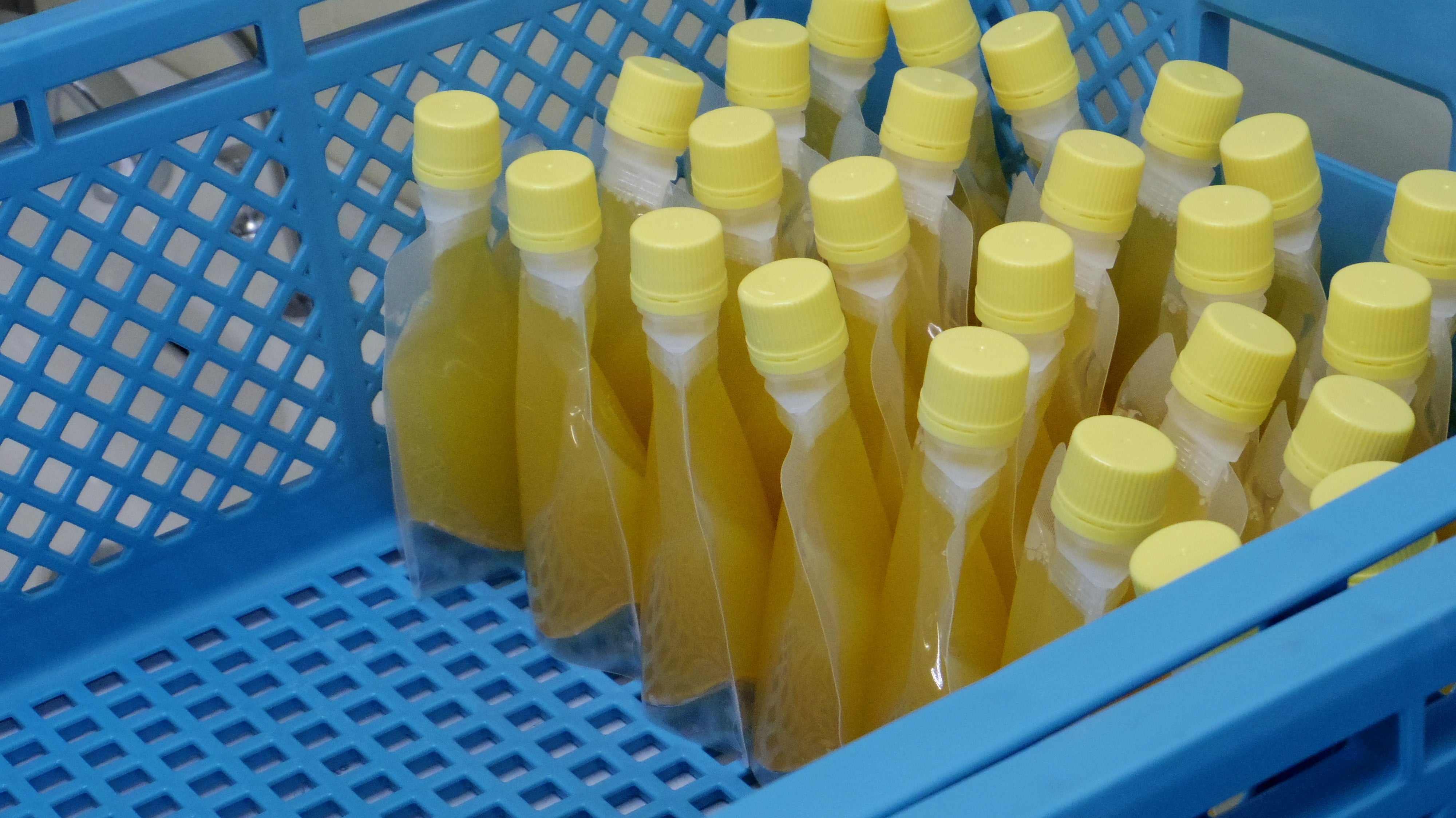 できたてほやほやで、湯気が出ています。のどごしへのこだわりからりんごんの品種によりゼリーとして固める素材を変えているのですが、ふじのほうは顕著にすぐに冷え固まってしまうので、ここから先は急ピッチで透明袋に詰める作業--充填(じゅうてん)と呼ぶ--を行います。