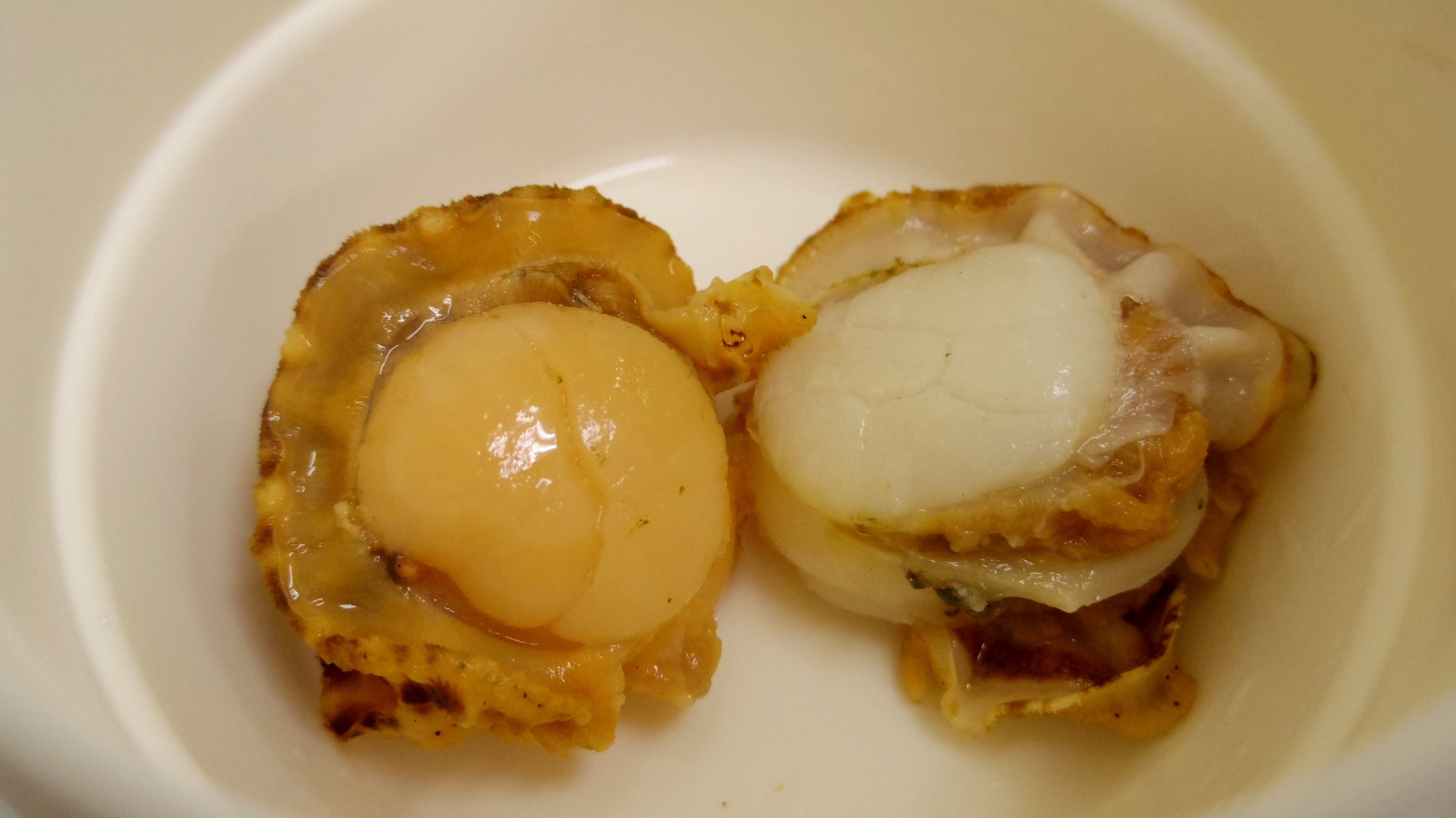 数あるほたての中に、稀に写真左のような「赤玉」があります。