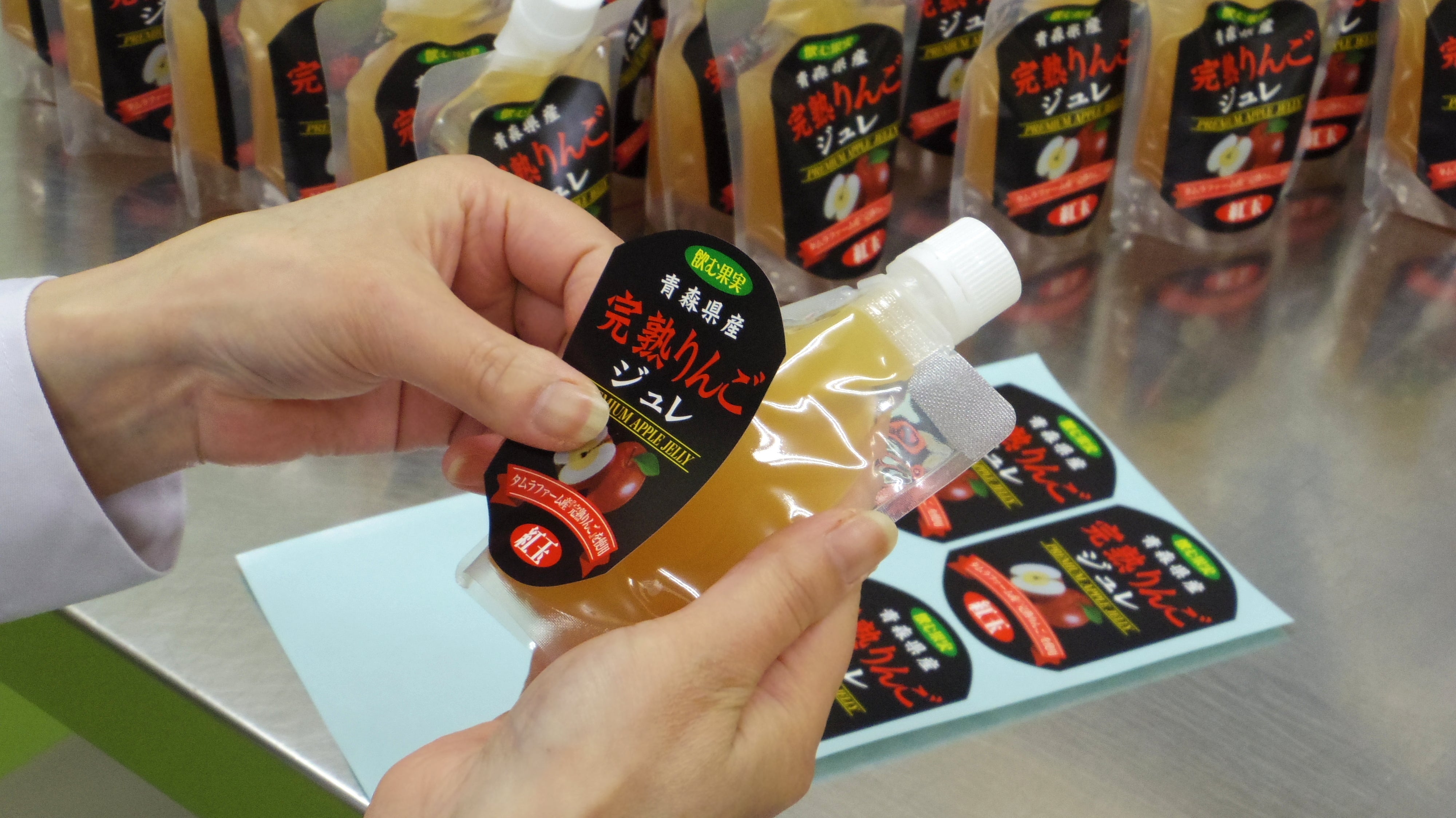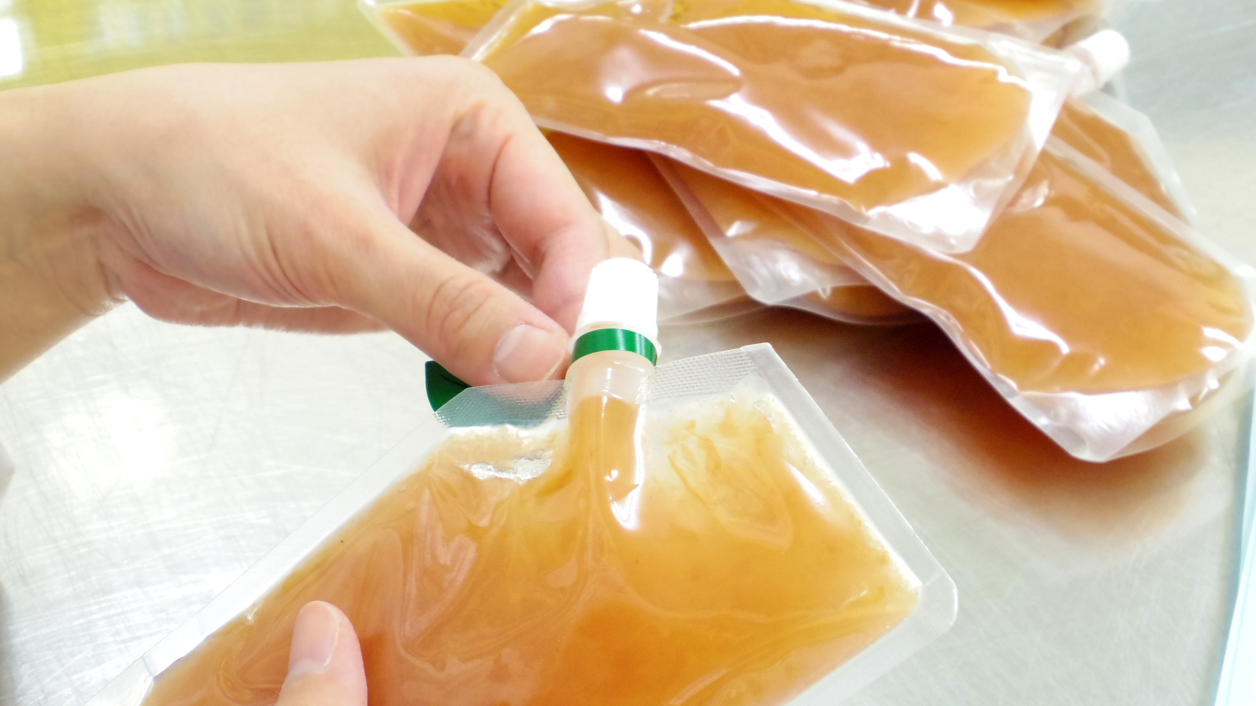 本日は青森県産完熟りんごジュレ(ふじ)の製造を行っています。青森県弘前市タムラファーム産の完熟りんご果汁に、その他の原料を混ぜて加熱・攪拌しているところ。 火加減もけっこう重要です。できたてほやほやで、湯気が出ています。のどごしへのこだわりからりんごんの品種によりゼリーとして固める素材を変えているのですが、ふじのほうは顕著にすぐに冷え固まってしまうので、ここから先は急ピッチで透明袋に詰める作業--充填(じゅうてん)と呼ぶ--を行います。 …とはいえ、品質基準に満たないものを袋に詰めてもダメなので並行して左上:水素イオン指数や、右下:糖度を測ったり(この測定器はテレビ番組の「鉄腕DASH」でおなじみかもしれません)します。水素イオン指数というとなじみのない言葉かもしれませんが、よく耳にする表現でいうと、どのくらい酸性か・中性か・アルカリ性かの確認です。 完熟りんごジュレは、りんごの酸っぱさからみなさまがイメージする通り、酸性です。黄色ブドウ球菌や大腸菌は増殖できないです。さらにこのあと加熱殺菌します。