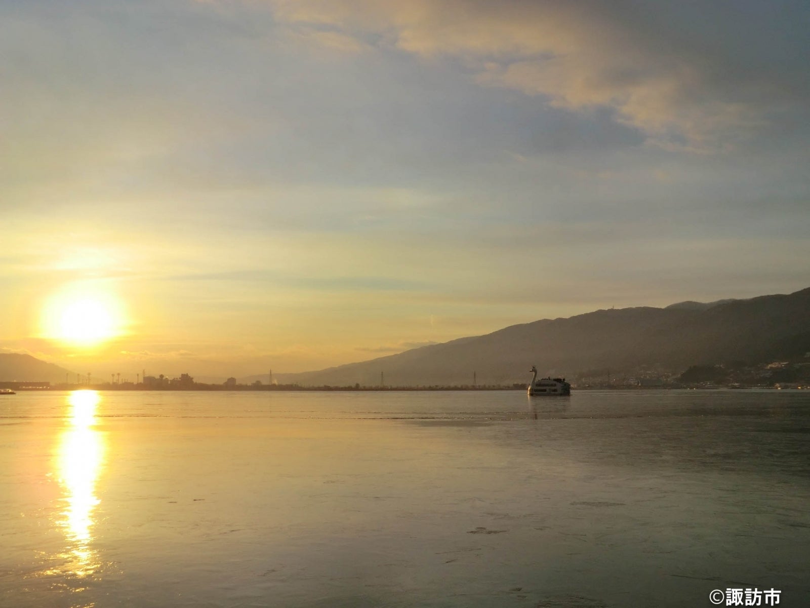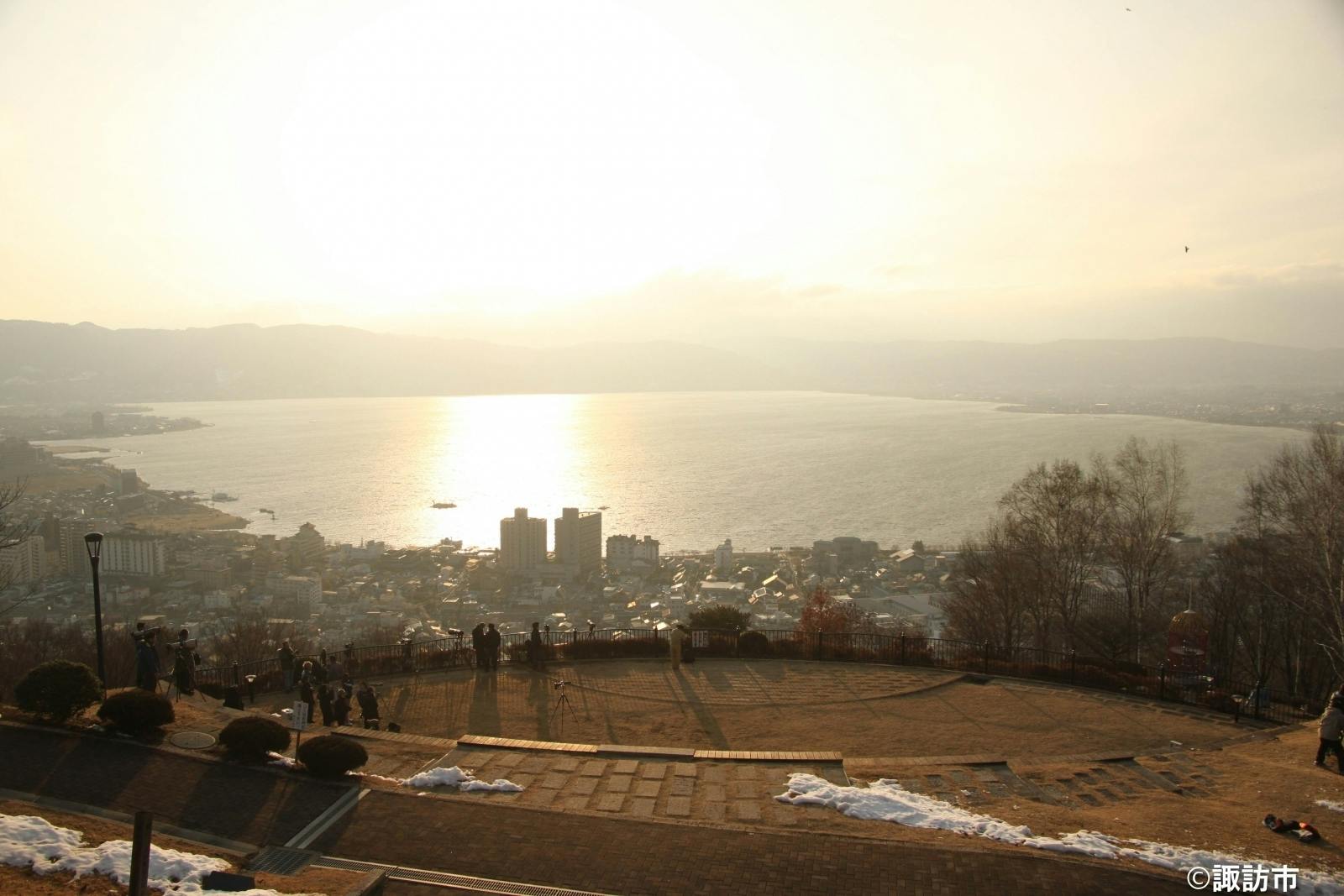 明朝、夕暮れ時にしか見ることができない橙色の空を写した諏訪湖は絶景で、12月中旬から2月下旬には白鳥が飛来することから数多くのカメラマン達がその絶景をカメラに収めようと集結します。