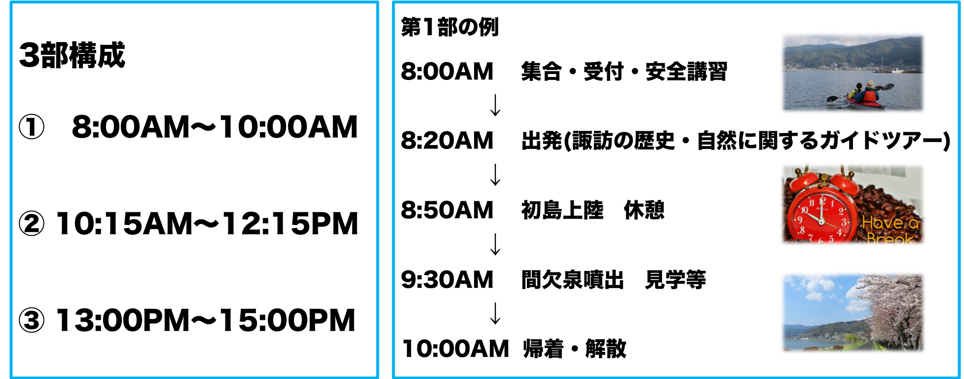 おうたき寺子屋についても、王滝村の学習の1拠点としてなくすわけにはいきません。寺子屋の営業時間は平日学校終わりの夕方から夜が多いため、並行して運営してまいります。諏訪-王滝間は車で約2時間。約100kmの道のりです。行き来は大変になりますが、お世話になった2拠点(諏訪市・王滝村)で仕事ができることは大変幸せなことだと考えますし、どちらも全力で取り組んでいきたいと考えています。諏訪湖カヤックはグリーンシーズン(4月〜10月)の営業を予定しております。