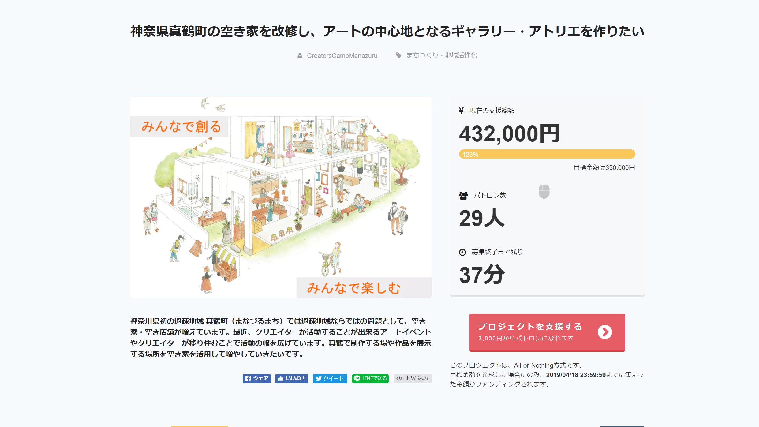 2019/04/18 23:38残すところ30分ぐらいですが、最後の追い込みで目標達成することが出来ました!クラウドファウンディングの募集はおしまいですが、まだ空き家を改修するスタート地点に立つ資格を得ることが出来ただけです。不安な気持ちで最後の方に来てしまい最後の追い上げを見て、もっと早く協力を仰いだり、相談に乗ってもらえば良かったという反省点が多々あります。都会ではできない真鶴だからこそ出来る応援ネットワークというもののパワーを見ることが出来ました。空き家を改修を社会貢献・社会課題という観点で協力を当てにしてお願いするのではなく、楽しい活動だから参加して、自然と空き家だった家がこんなにキレイになっちゃった「ドヤッ!」という感じの真鶴らしい明るい改修活動に出来るように頑張ります!不安な気持ちで手持無沙汰だったので真鶴まちなーれで撮影した動画の編集をしていました。【ただいまなづる】しげさんが作詞作曲した曲をciciが歌います。この曲の最後の歌詞ですわたしの ふるさと ただいまなづる この空き家ギャラリー・アトリエを使用した人が、「わたしのふるさと」と呼べるような場所に出来るように頑張ります!これからもご協力よろしくお願いします! もっと見る