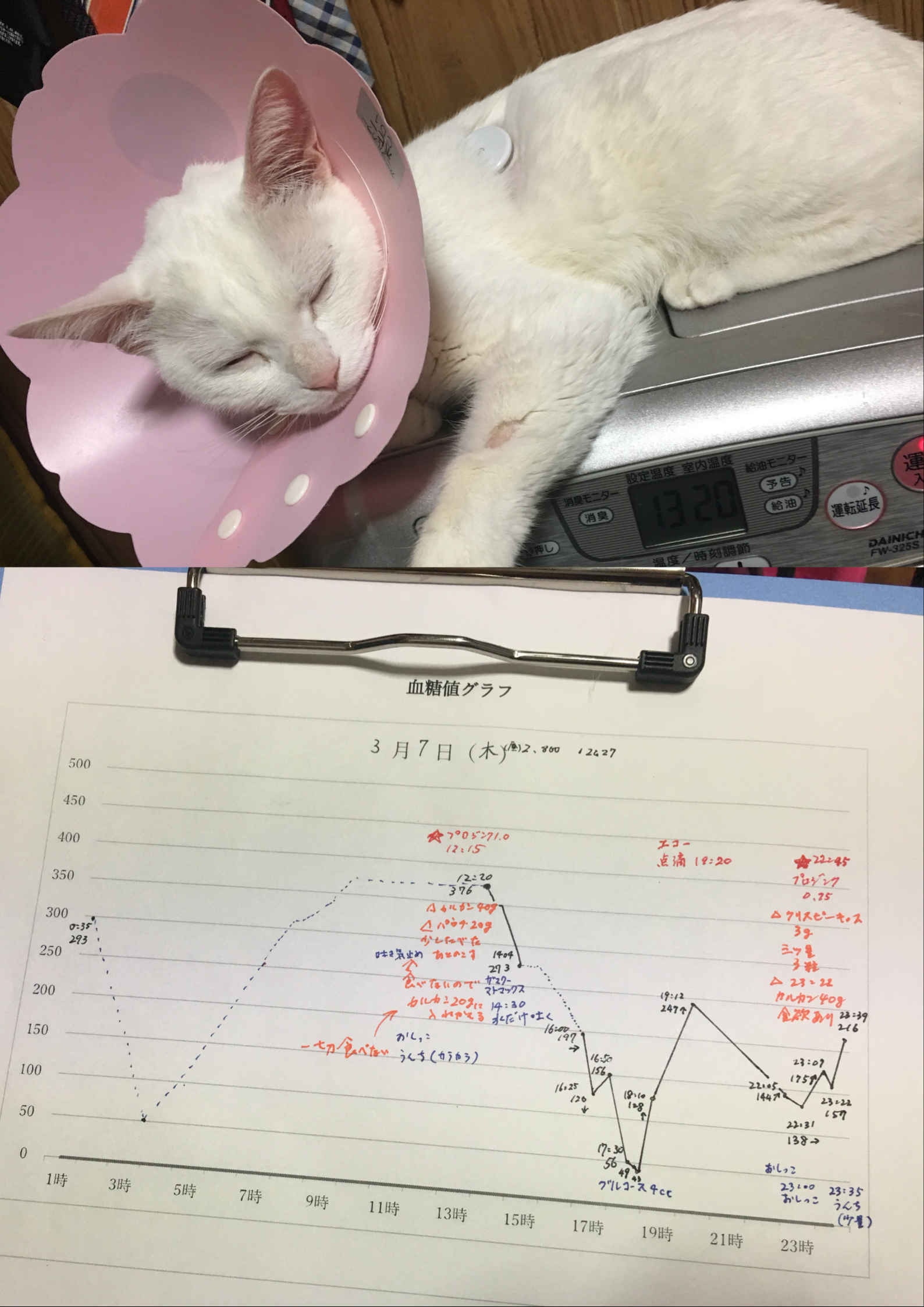 ケトン体が出ないように1時間に1回は血糖値を計り、高い状態を維持させないようこまめにインシュリンを注射したり、低血糖にならないようブドウ糖を舐めさせたり、ごはんを1日6回に分けて、カロリーや量を細かく管理したりと、やらなければならない事も多く、出来る限り側についていなければなりません