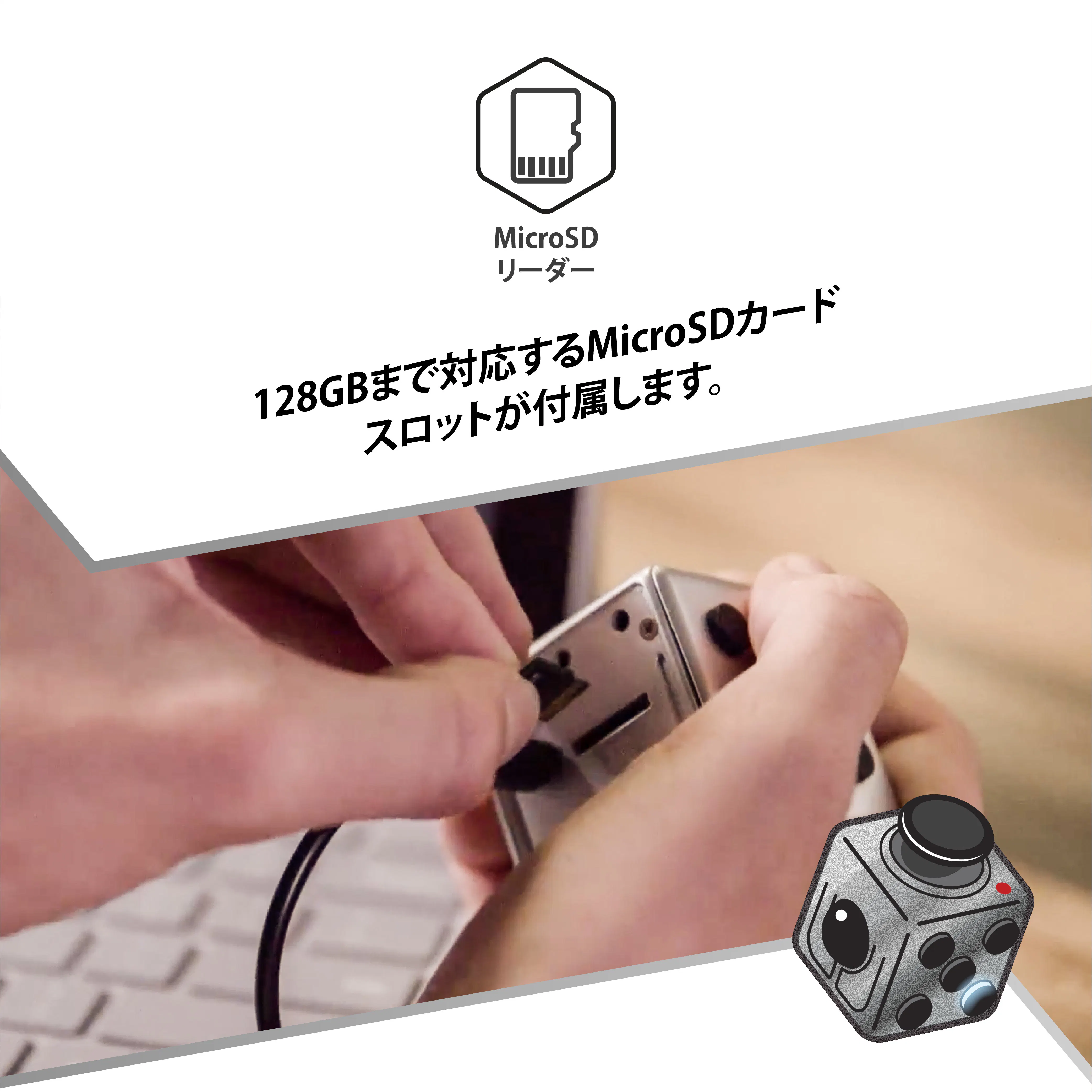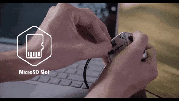 128GBまで対応するMicroSDカードスロットが付属します。