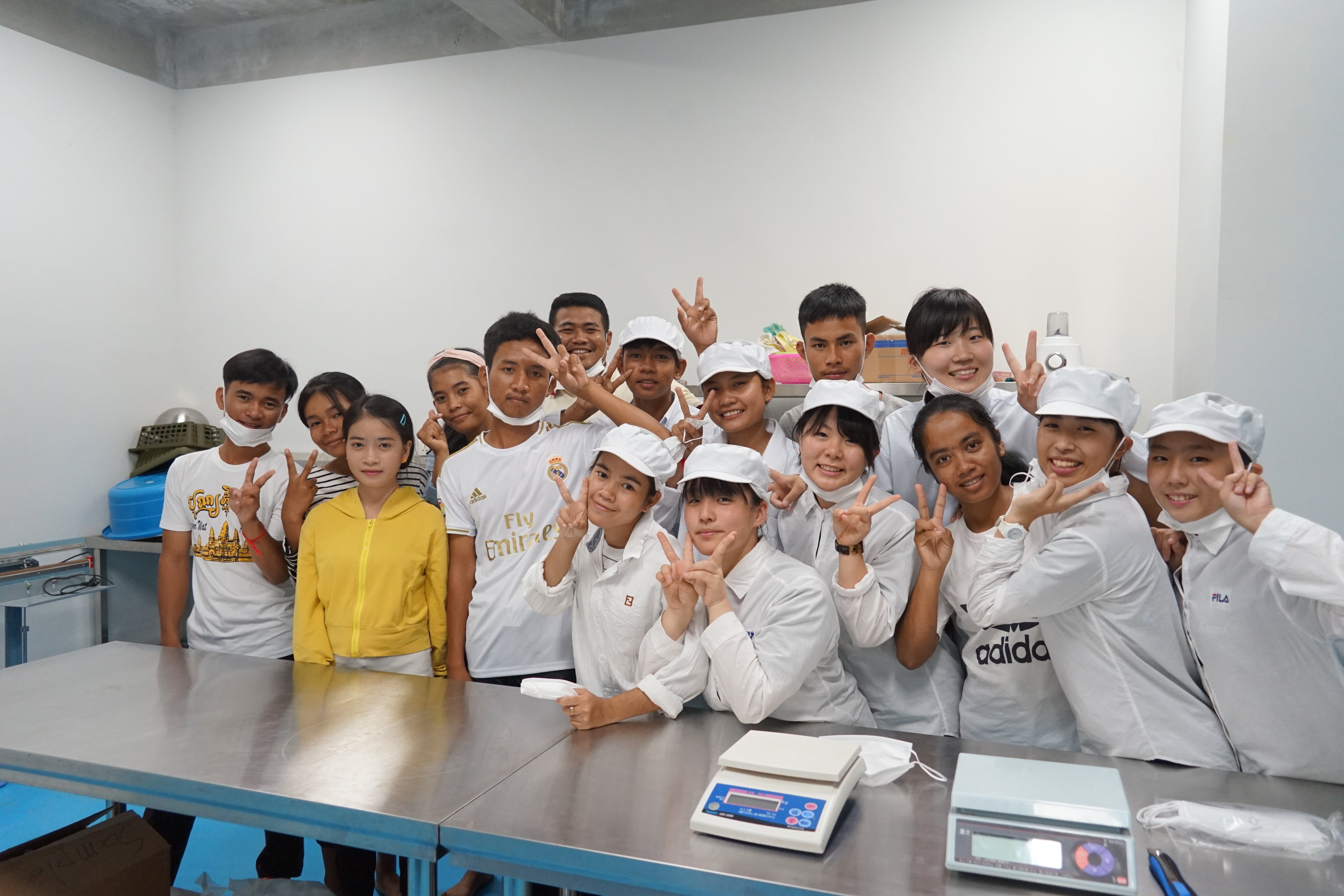 また、友好学園内にある食品加工工場での工場実習も行われました。生徒はこの工場実習を通して衛生管理や商品の製造に関することを学びます。カンボジアと日本では、まだまだ衛生意識や製造方法に差があるため、カンボジアの高校生たちは興味津々の様子でした!