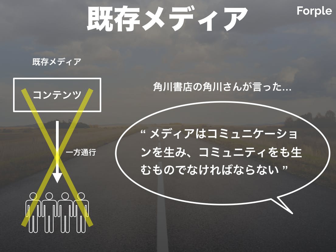 角川書店の角川 歴彦さんは、既存メディアは一方通行の発信ばかりであるとおっしゃったのが、印象的でした。メディアとは、コミュニケーションを生むためのツール。これは、今のメディアにはない要素です。