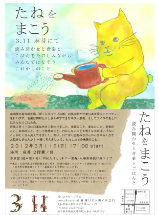 2012/02/08 17:243月11日に名古屋市中区大須の麻芽さんでチャリティーイベントを開催します。昨年12月に引き続き、「ぼくにぴったりな種」の読み聞かせ第二段です。*内容*斧洞望の自作紙芝居「ぼくにぴったりな種」の読み聞かせ東日本大震災チャリティーを行います。音楽は田村たけしさんのすてきなギター演奏。そしてライブのあとにはみんなでごはん会。 昨年3月11日に日本は大きく変わりました。地震のこと、東北のこと、原発のこと、日本のこと、そして世界のこと、わからないことや考えなければいけないことがたくさん見えてきました。おいしいごはんを囲みながらのんびりみんなでお話をしませんか?一緒に考えましょう、わたしたちの未来のこと。 これからの未来のこと、一緒に考えましょう。2012年3月11日(日)17:00 start場所:麻芽 2階賽ノ目斧洞望(読み聞かせ)、田村たけし(ギター演奏) 入場無料投げ銭ライブжごはん会は要予約。3月9日までに予約してください。 問い合わせ・ご予約hemp&natural麻 芽(1F)・賽ノ目(2F)愛知県名古屋市中区大須4-1-12tel 052-243-7242 地下鉄名城線矢場町駅4番出口徒歩3分 もっと見る