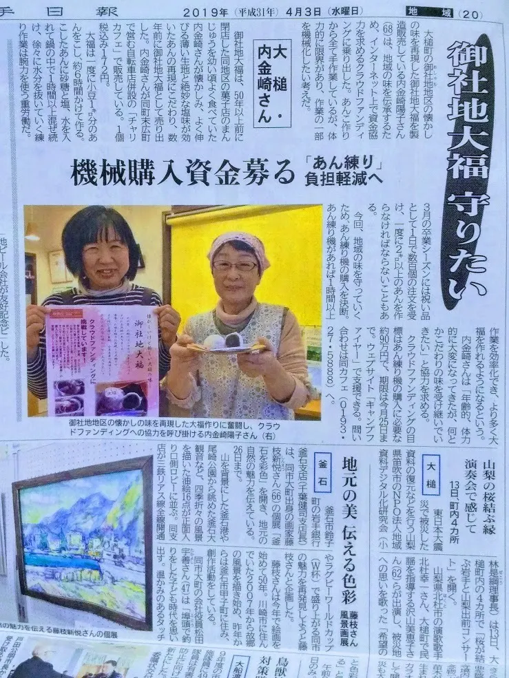 高齢で体力的にも限界に近づいてきたところで、あん練機なるものがあると知り、購入したくても高価すぎるし、仮設店舗から本設へ向けて高額の高額の資金調達をしたばかり、そんなところに復興庁さんの「被災地企業の資金調達支援事業」を紹介していただき現在進行中のクラウドファンディングに挑戦している次第でございます。