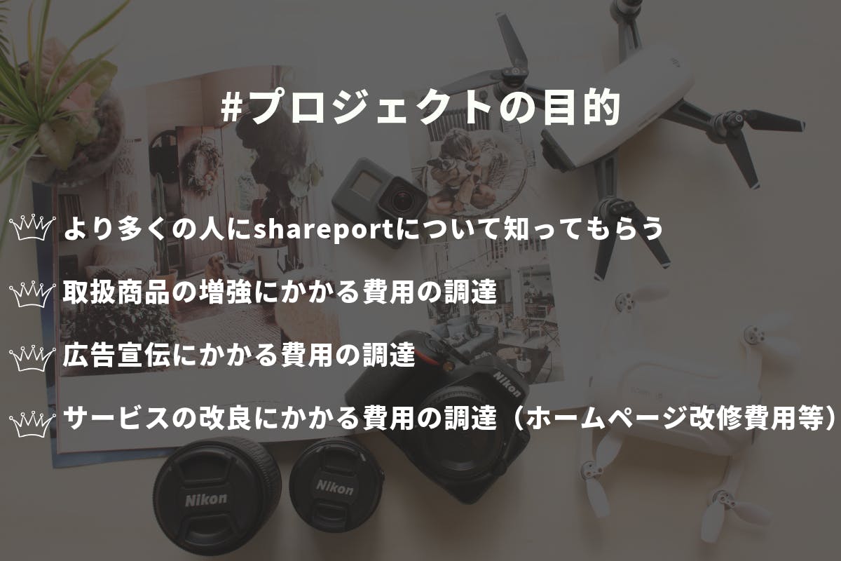 そこで「shareport」では、一眼レフカメラ、ゴープロ、ドローン、ビデオカメラ、水中カメラなどの「ガジェット」も手軽にシェア出来ないかと考えました。