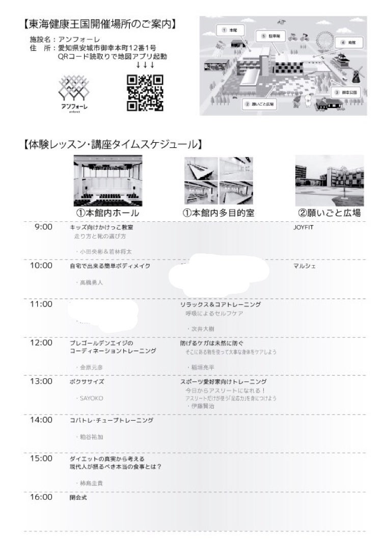 「 東海健康☆王国 ~運動と健康で地域の人々を笑顔に~ 」と題し、愛知県安城市のアンフォーレ安城で各フィットネスの専門のトレーナーが講師をし、正しいケアの方法やトレーニングの「本質」を伝えます