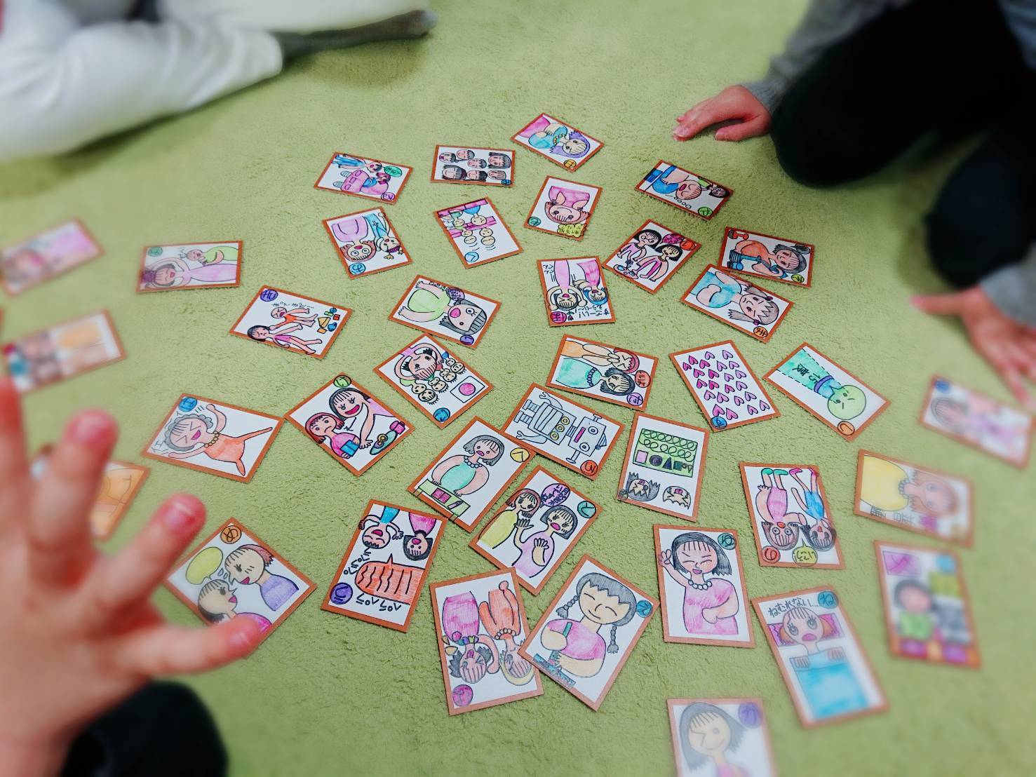 家族・クラス・グループで自分の作ったカードを持ち寄り、ステップ1.2の順ででカルタをする。