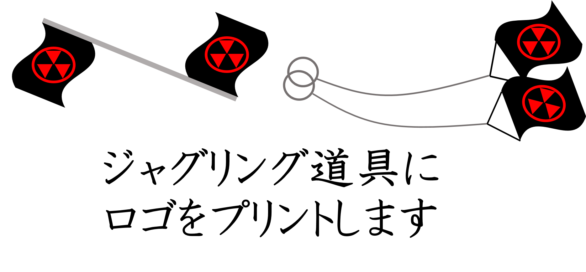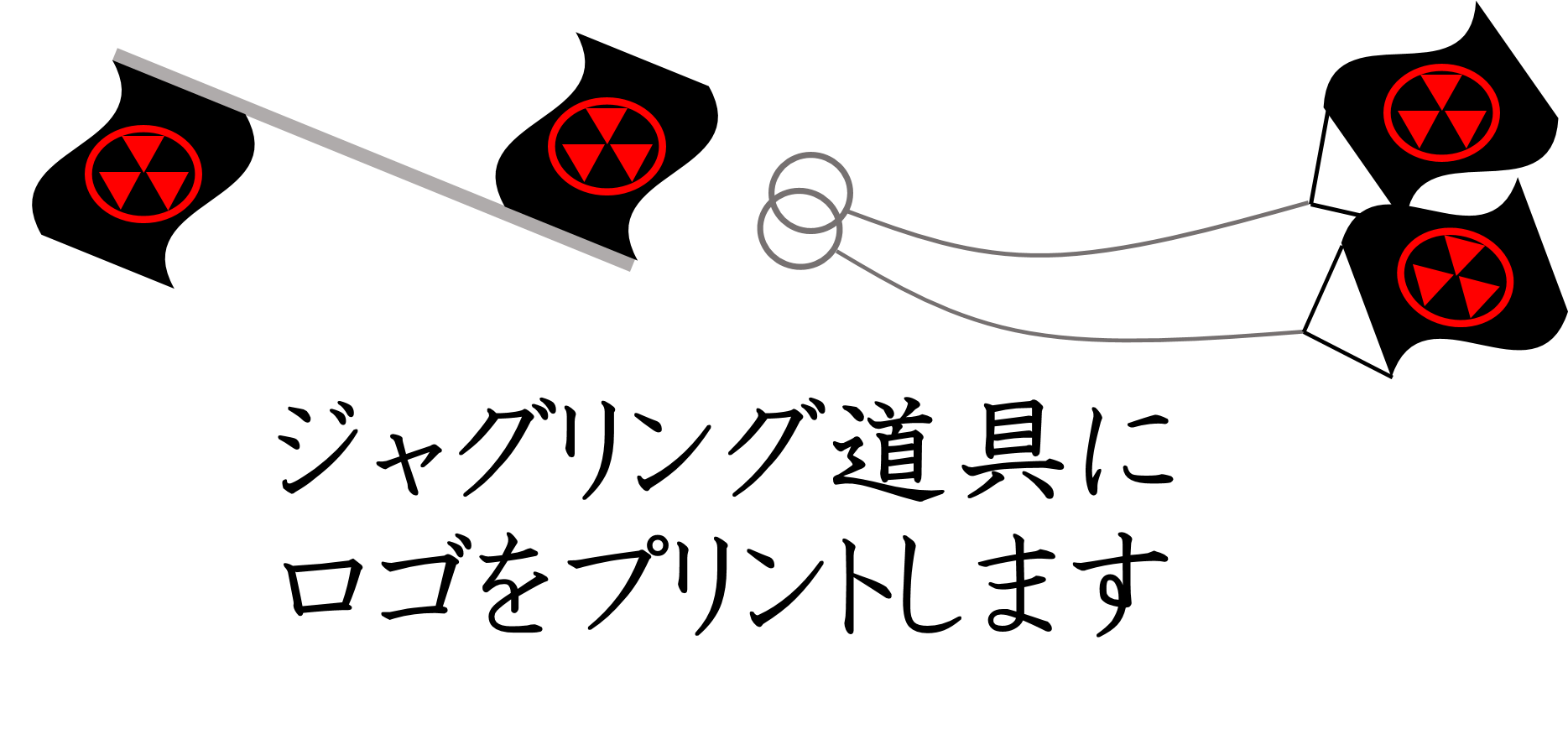 - (期日内に指定のメールアドレスにロゴ(デッサンや写真でも構いません)を送っていただき、ジャグリング道具の生地素材にロゴを直接プリント致します。送っていただいた資料はプリントできるように最大限再現致しますが、細かい点に関して至らない場合があることをご了承下さい。また入れるロゴの数が多くなった場合は、一つのジャグリング道具に複数のお名前が入ることをご容赦下さい。)