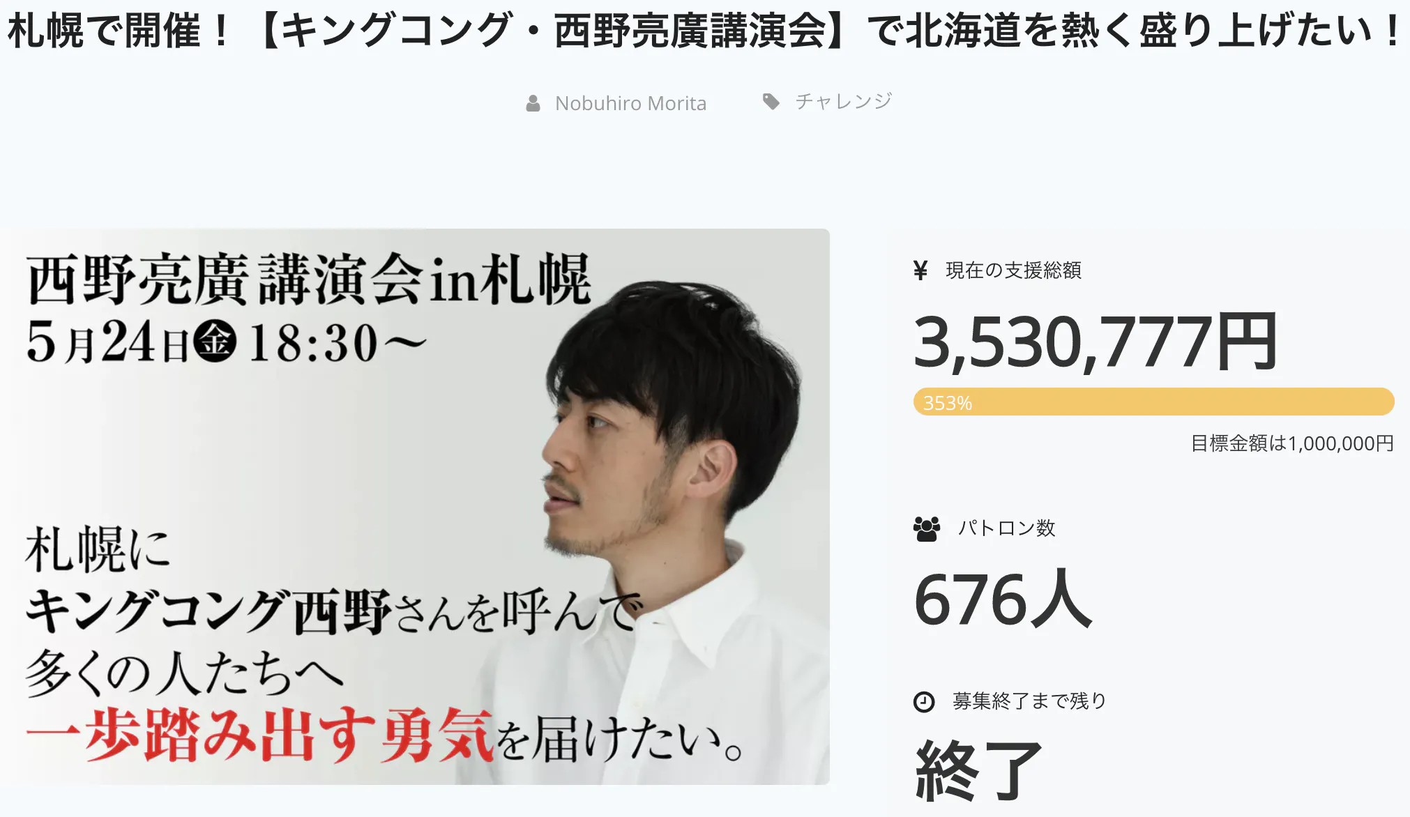 2019/05/26 15:50キングコング西野亮廣講演会in札幌を無事、何事もなく終えることができました!ただ単にアイデアだけでゼロベースからスタートしました。だけど気づけば、資金はクラファンで676人の世界中の人達からの支援で353万集まりました。運営はクラファンのリターンを決定してくれた80名のスタッフとオンラインでやり取りしてきました。やりたいと思えば、今はお金も人も集めることができる。でも、そこには信用とか共感が無いと成立しないということを今回学ばせてもらいました。一歩踏み出す勇気この想いに共感してくれた仲間が居たからこそ、今回の講演会を開催することができました。僕はアイデアを出しただけ。でもそこに共感してくれる人たちが、世界中にいたんです!世界中の人たちと思いを1つにすることなんて、絶対できないと思ってた。でも今回のチャレンジでわかったんです。やっぱり「思考は現実化する」出来ないことなんてない。やるかやらないか。ただこれだけ。今回僕の中でも、ちょっと見えた景色があります。ここで学んだことを、次に繋げていき、もっと誰かのためになる事をしていきます。またおもろいことやりますので、また関わってやろーか!と思っていただけたなら、またご支援ご協力賜れればと思います!早ければ8月にオモロいことやろうと思っています!来月中旬くらいにオープンにしますので、よろしくお願いします!!では、簡単ではありますが、この度の御礼の言葉と変えさせていただきます!ありがとうございました!!! もっと見るいよいよ開催まで1週間!!!