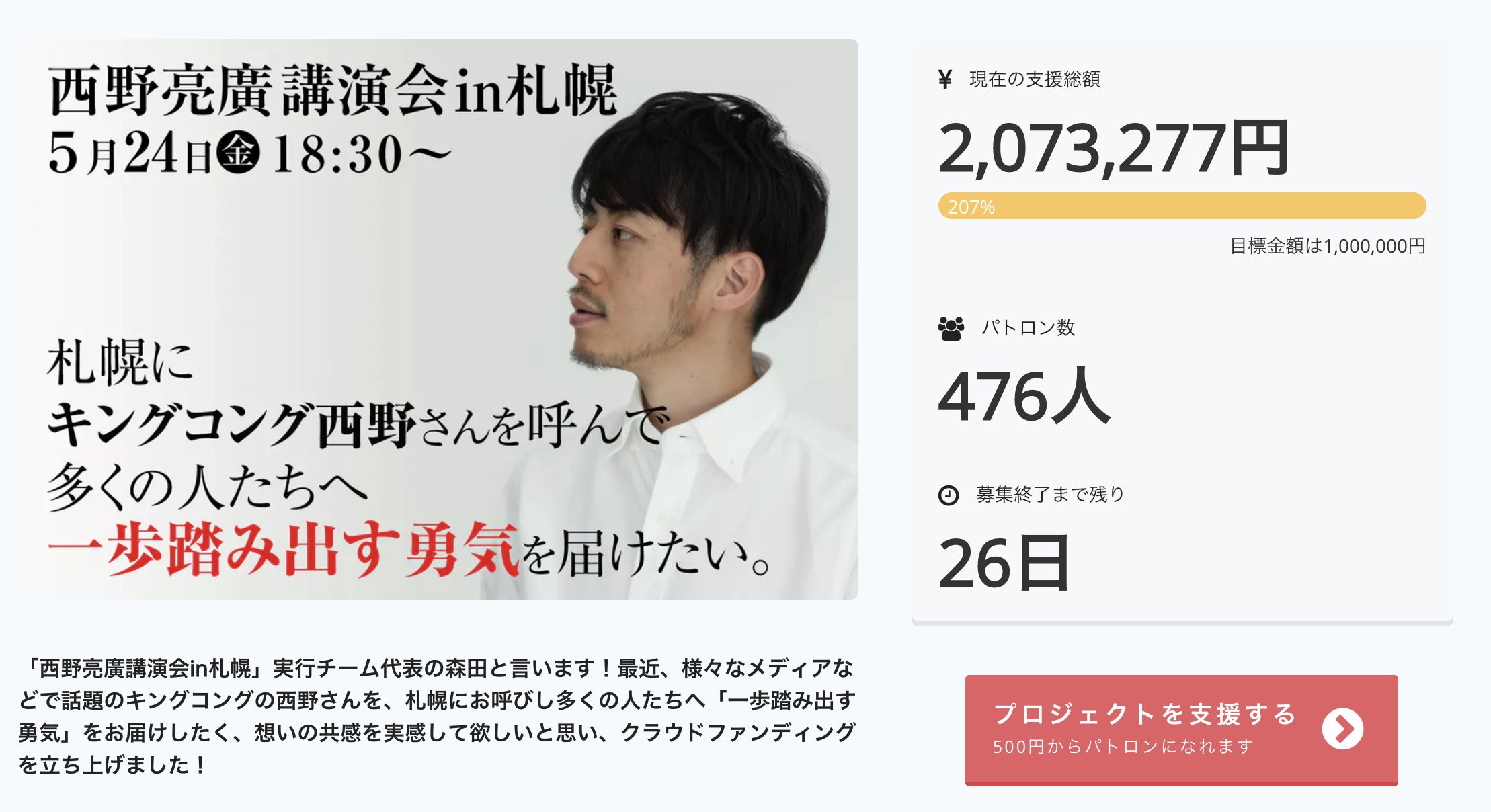 キングコング西野亮廣講演会in札幌を無事、何事もなく終えることができました!ただ単にアイデアだけでゼロベースからスタートしました。だけど気づけば、資金はクラファンで676人の世界中の人達からの支援で353万集まりました。運営はクラファンのリターンを決定してくれた80名のスタッフとオンラインでやり取りしてきました。やりたいと思えば、今はお金も人も集めることができる。でも、そこには信用とか共感が無いと成立しないということを今回学ばせてもらいました。一歩踏み出す勇気この想いに共感してくれた仲間が居たからこそ、今回の講演会を開催することができました。僕はアイデアを出しただけ。でもそこに共感してくれる人たちが、世界中にいたんです!世界中の人たちと思いを1つにすることなんて、絶対できないと思ってた。でも今回のチャレンジでわかったんです。やっぱり「思考は現実化する」出来ないことなんてない。やるかやらないか。ただこれだけ。今回僕の中でも、ちょっと見えた景色があります。ここで学んだことを、次に繋げていき、もっと誰かのためになる事をしていきます。またおもろいことやりますので、また関わってやろーか!と思っていただけたなら、またご支援ご協力賜れればと思います!早ければ8月にオモロいことやろうと思っています!来月中旬くらいにオープンにしますので、よろしくお願いします!!では、簡単ではありますが、この度の御礼の言葉と変えさせていただきます!ありがとうございました!!!