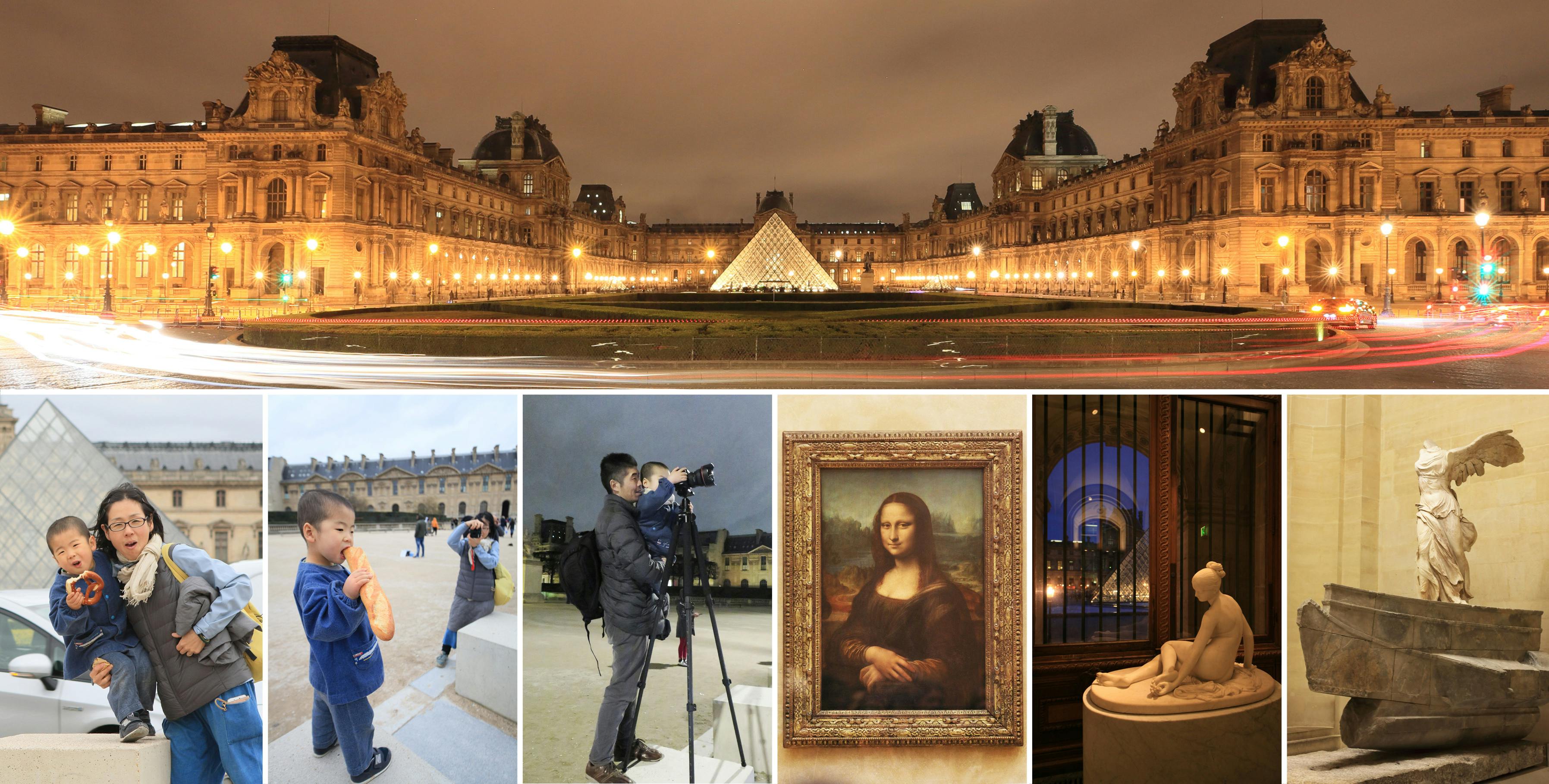 モナリザの前では機嫌悪かったが、息子がルーブルをバックにフランスパンを食べている姿は面白く、ベストショットを狙って両親は撮影しまくり。