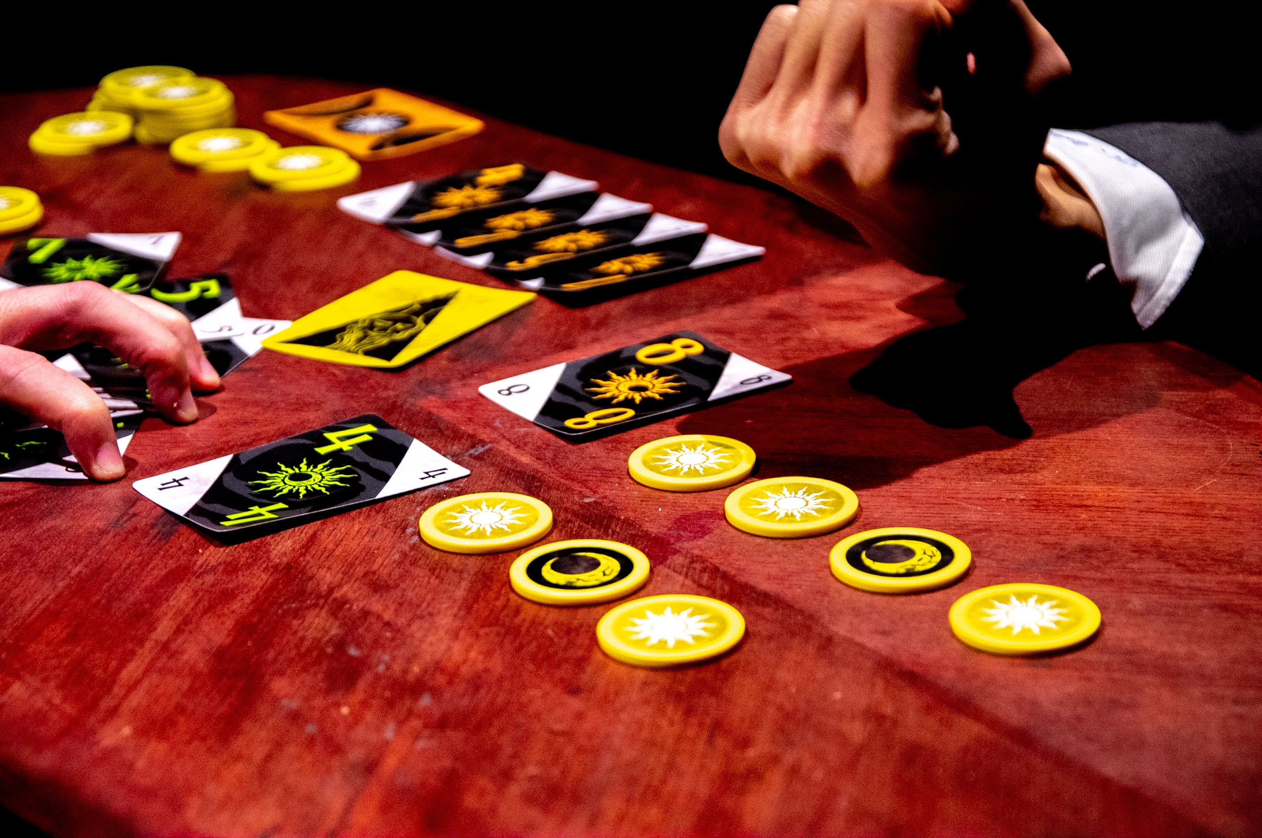 連続でパスをするか、テーブル中央に合計9枚のチップが積まれればラウンド終了。