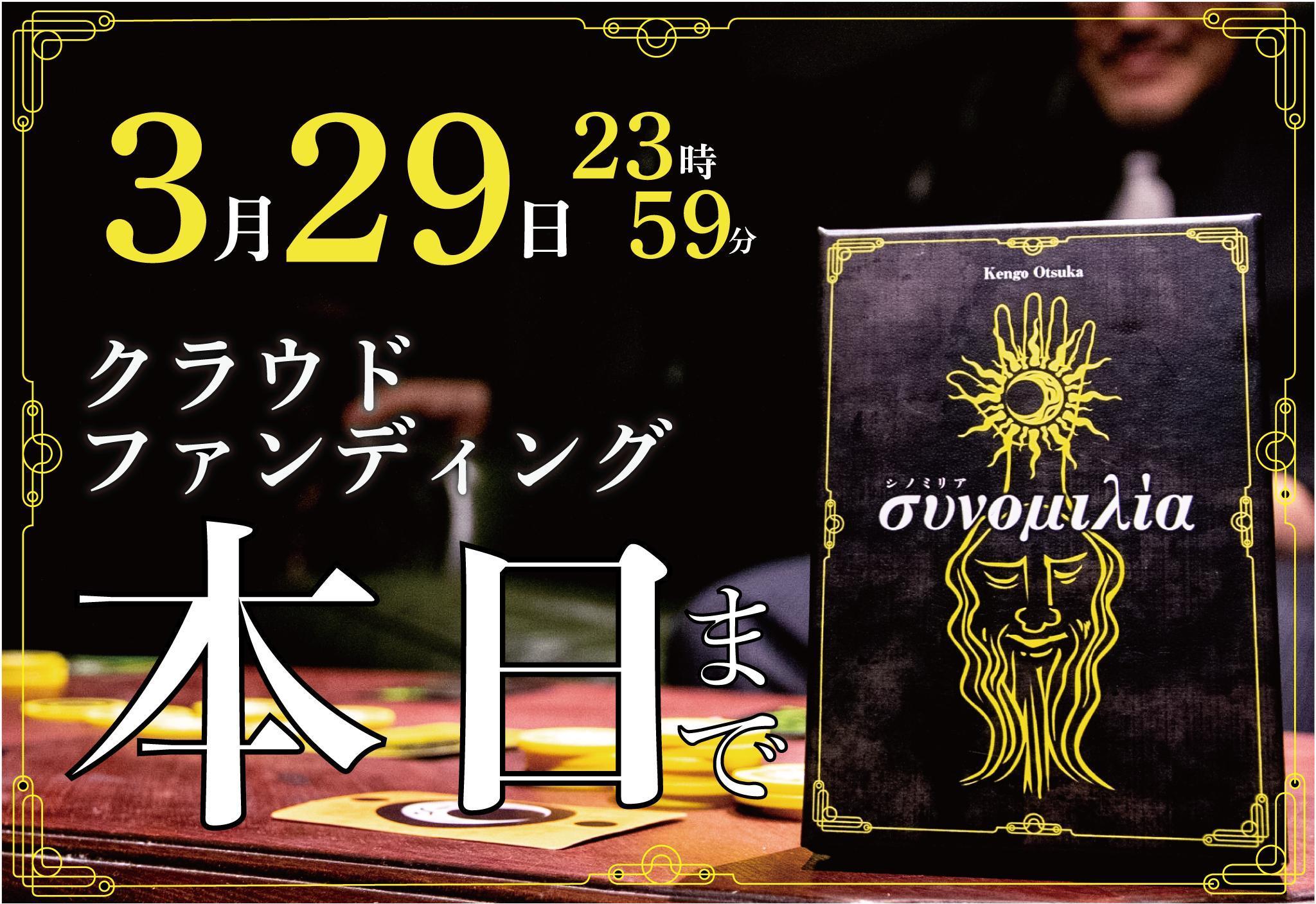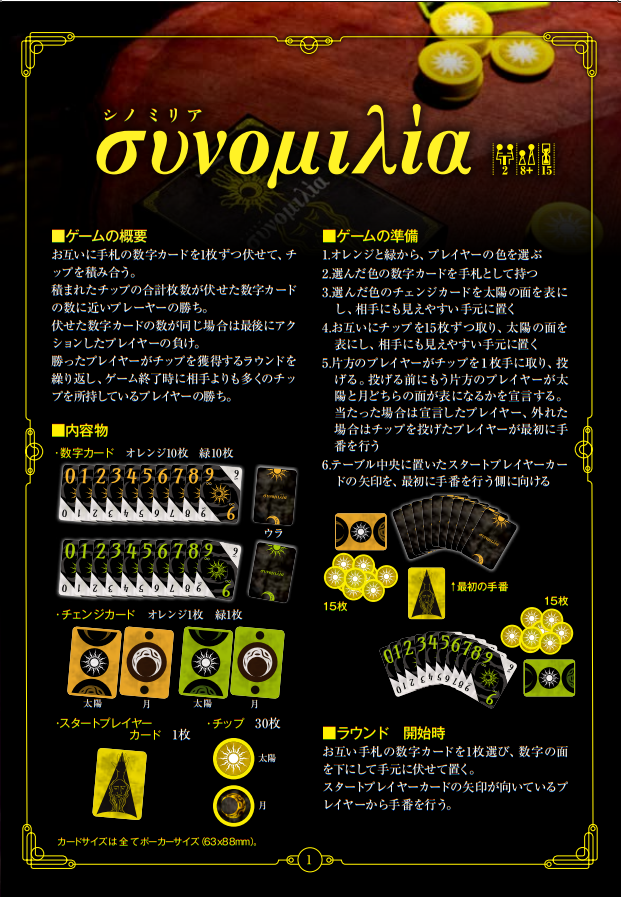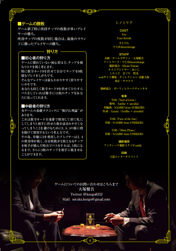 2019/03/29 17:45135万円達成!!というわけで、デザインメモ一応最終回です。内容は①「シノミリア」アイデア根幹について②プロモーションについて(一部)①「シノミリア」アイデア根幹についていきなり余談ですが、ちょっと憧れがあります。こう、女子オシャレフレンチ的な店に行ってワインが出てきたときに「このワインはね、ある労働者たちが貧困の中‥‥」みたいにうんちくを語るヤツ。何の話かと言いますと、『シノミリア』をご購入いただいた方にそういううんちくを語ってもらえたらうれ.しいなということで、『シノミリア』がどう生まれたのかを少し書いておこうと思います。まず、きっかけは10年前にアルバイトしていたときですね。4人で働いてて、仕事を終えてみんなで事務所にあがったとき。差し入れとして、20個のみかんが届いていました。で、バイトリーダーの大塚はある提案を思いつきでなんとなくしました。「20個のみかんが1時間後に何個残ってるか予想して紙に書いとこう。一番近い人が勝ちね」このゲームは次のように展開しました。・大塚ハンデを提案「僕は1個もみかんを食べない」・全員残り個数を予想・大塚と友人「俺らの予想個数は多い。だから全員みかんを食べるな」・男子高校生と女子大生同時にみかんを食べ出す・残り13個あたりで女子大生食べるのをやめる・残り8個あたり男子高校生苦しみ出す・残り6個、友人「お前だけに苦しい思いをさせないぜ!」とみかんを食べ出す・残り5個、男子高校生みかんを食べるのをやめる・友人みかんを食べきり残り0.ゲーム終了・それぞれの予想公開。結果。友人0 男子高校生5 女子大生10 大塚0 勝者2人・男子高校生、次の日お腹をこわすそんな感じになりました。はい。上記のルールを聞いただけで察した方もいらっしゃるでしょうが、このゲームは“残り0個と書いてみかんを全て食べてしまえば必勝”です。このゲームであったことをまとめると1.残りの数予想を大きく書いた女子大生はこのゲームにおいて損な選択をしている2.残りの数予想を小さく書いて一生懸命食べた男子高校生は可愛いし、お腹いたくなっている3.残りの数予想を0にして、前半は後輩に食べさせて楽をした友人はカッコイイ4.それすら読んで、0にして、1個も食べなかった僕はさらにめっちゃカッコイイそんな感じです。この思い出を正しくゲーム化するにあたって、良い部分を明確に表現、悪い部分は修正するという必要がありました。具体的には、1.大きい数字を書くという選択肢に意味を持たせること2.みかんを食べるという行動にお腹をこわす様なリスクを負わせること3.残り0と書いても自分はなかなか食べないという行動を評価すること4.盤面を一切操作せず勝った自分にさらに明確なリスクを負わせることそして何より、“残り0個と書いてみかんを全て食べてしまえば必勝”ではなくすることただ、最後の一番重要な部分の変更がとても難しく、この部分は上記のゲームの駆け引きのキモであり、その穴を埋めるのはゲームの面白さの大部分を損なうことになります。そこで、求められるのは抽象的な表現をすると、“ふわっと蓋をしてあげる”必要がありました。結果、どのように蓋をしたのかはこちらの竜也さんを観ていただければ伝わると思います。その他、それぞれのルールがどのような意図で作られているのかも語りたいですが、そちらは攻略本の方に書きたいと思います。②プロモーションについて(一部)プロモーションについても文章にしてほしいとのコメントをいただきまして。前提として、いろいろなすごい方々にご協力いただいていて、僕が語れる部分はわずかですが、その一部を書いておこうと思います。まず、『シノミリア』は当初非常に魅力を伝えづらい作品でした。その理由はメカニクスの独自性で。人に何かを伝えるときに最もわかりやすいのは相手が知っている何かに例えて話す、ことだと思います。例えば、「このゲームは正体隠匿系です」とか「トリックテイキング」の様にジャンルで説明できると、それを知っている相手にはどうようなゲームなのか伝わるし、そのジャンルのファンの方に購入してもらえるかもしれません。が、『シノミリア』は上記の流れから制作してゲームであり、そうした伝え方ができません。そこで、自分がプレイヤーにどんな風に楽しんでもらいたいのか、から改めて整理し、定義したものがあります。それが自分にとってのボードゲームの原体験である“ギャンブル漫画の主人公のようなボードゲーム体験”というワードです。そんな風に例えられないゲームを例えてみました。『シノミリア』プロモーションのあれこれは全てこの定義の元、作られています。なので、プロモーションで唯一僕が仕事したことがあるとするならば、この定義付けをしたことです。‥‥や、さすがに唯一ってことはないですね。他にももうちょっとがんばったことはあるので、そちらも攻略本に書こうと思います。