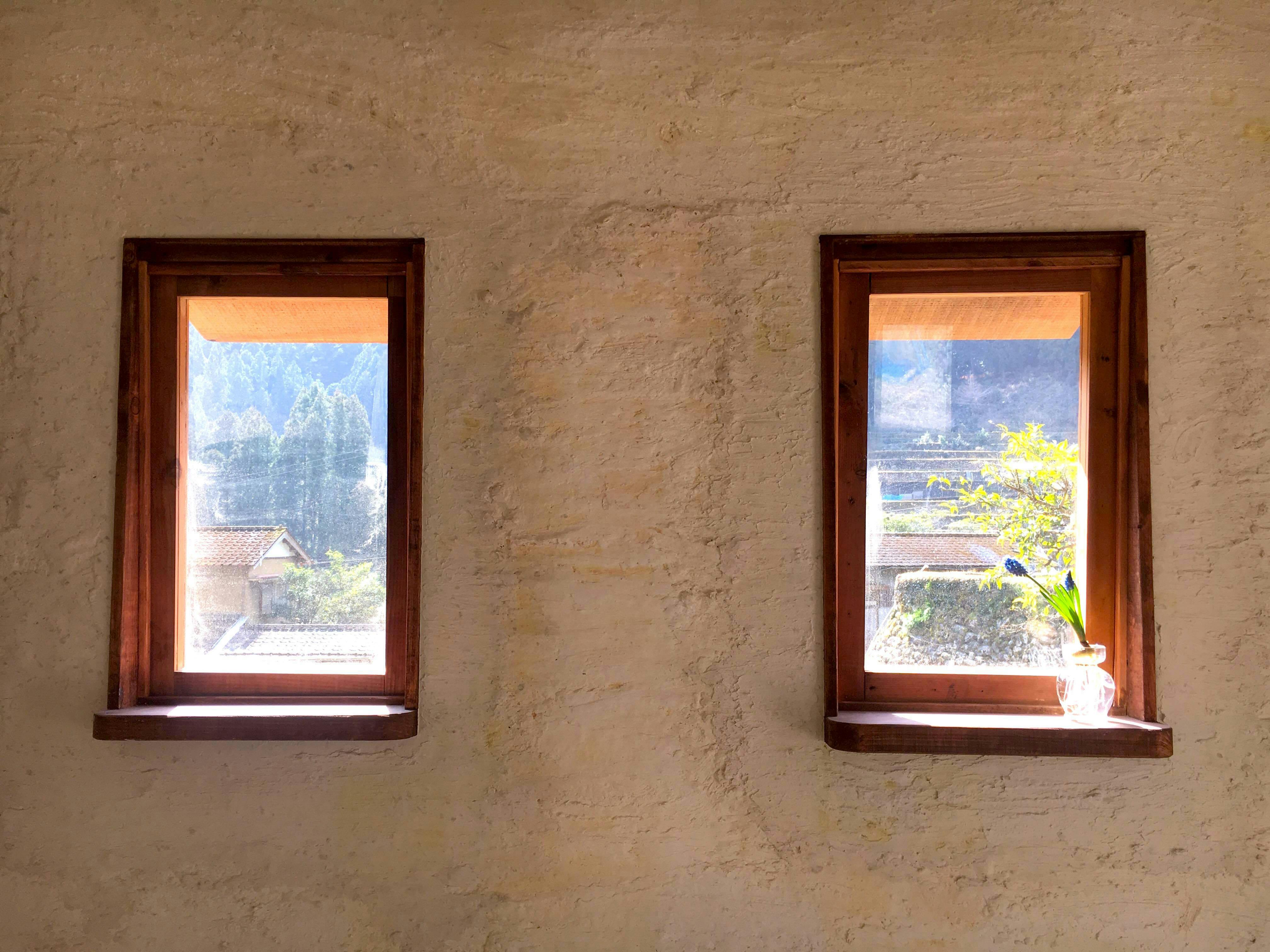 ショップ&ギャラリー「素素」の田園風景を望む窓。建設中の壁には漆喰が塗られたばかり。(写真は松重真希子さんより提供していただきました)