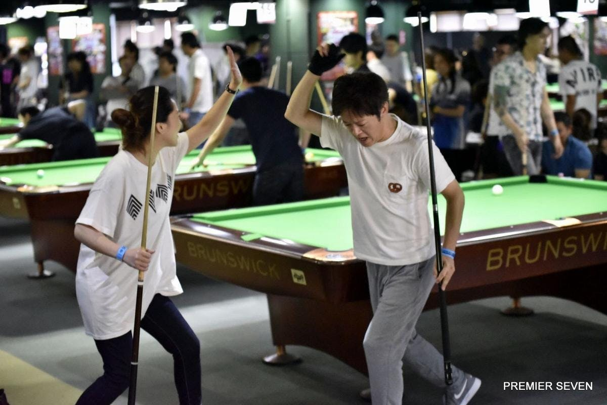プレミアセブンでは毎回フリーボール(好きな場所に手玉を置ける)という 初心者でも楽しめる特別ルールを採用!ペアでの参加なので、ゲーム中は 仲間同士相談もありです。公式テーブルは一回り小さいサイズの台なので、 さらにプレイはやりやすいでしょう。ペアのレベルに合わせたハンディ キャップもあるので、初心者から上手な人までみんなが楽しめます。