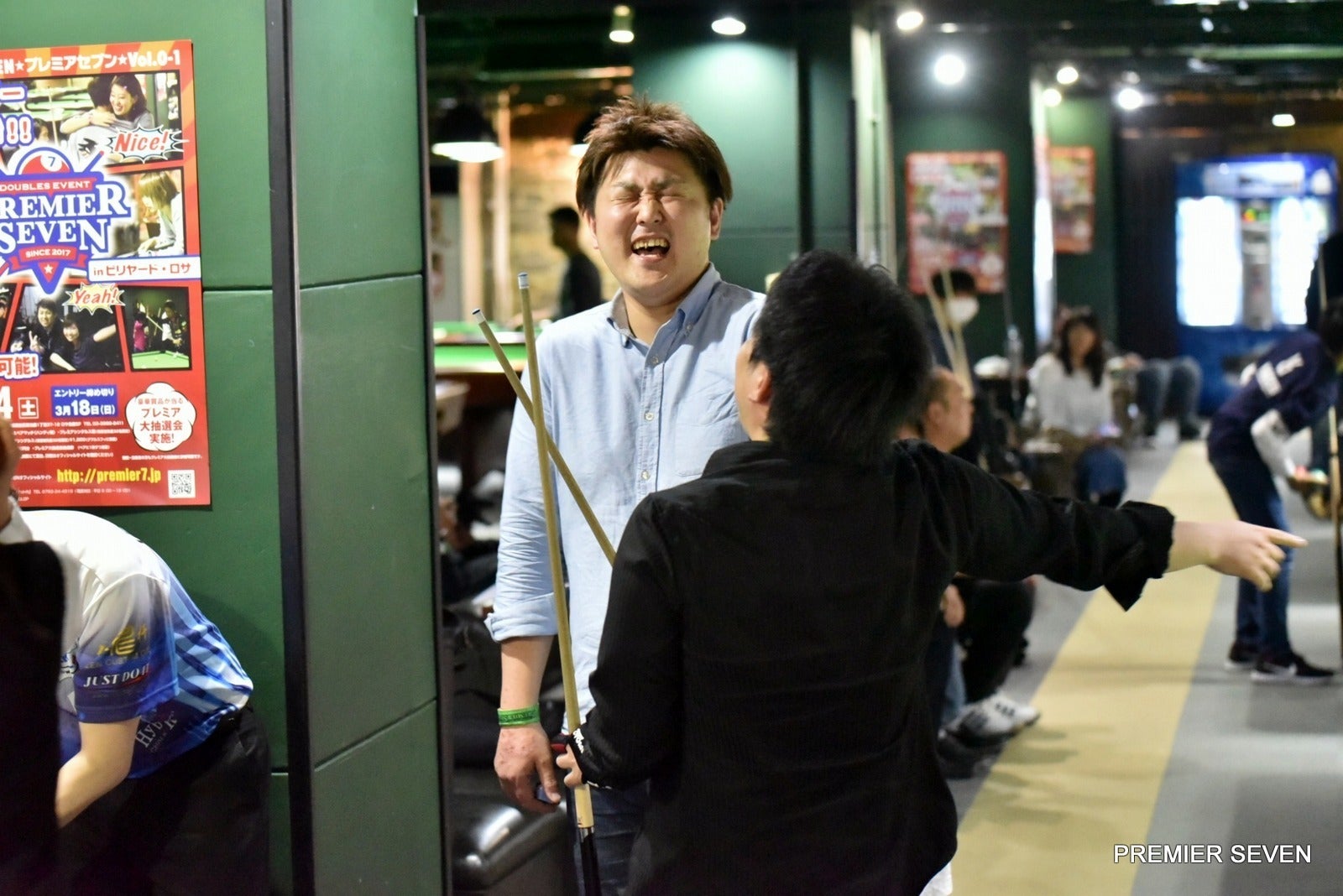 土方隼斗プロ・・・ビリヤードの試合は普通は1対1なので、プレイヤーも観客も静かなのですが、この「プレミアセブン」というイベントは二人一組のチーム戦なので、参加者も応援している人もとっても盛り上がるいいイベントだと思います。プレミアセブンで採用されたルールは、実は僕が考案した「カウントナイン」というゲームで、初心者から上級者まで一緒に楽しめるように工夫してあります。プレミアセブンがこれからもっとたくさんの人に参加してもらえたら嬉しいです。
