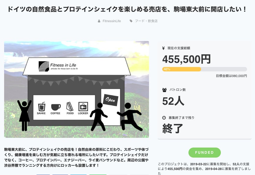 2019/05/06 01:14こんばんは、佐藤です。投稿が遅くなり大変申し訳ありません。パトロンのみなさまにはメールをお送りさせていただきましたが、4月29日(月)23:59をもって、CAMPFIREでの支援の募集は終了となりました。のべ52名ものみなさまに、455,500円ご支援をいただきました!改めまして、本当にありがとうございました!今回KIOSKをオープンするのには、敷金礼金や手数料を含む家賃関連、内装工事関係、機材や備品の購入などで400万円程度の出費となりました。卸業の方で自転車操業をしているため、運営資金として借り入れをしている分では突然決まった今回の出店費用を全額賄うことは到底無理でした。ご支援を賜り、本当にありがたいと思っています。でもお金以上に、パトロンの皆様の存在そのものがとても力になりました。素敵なコンセプト・豪華な内装の飲食店やカフェを見かけたり、競合の大々的なPR活動を目の当たりにしたりすると、何かと不安になりました。「本当にこれでいいのかな」「これで合っているのかな?」と。経験のない仕事の中で多くの選択を迫られるときに、パトロンのみなさまがいる!私たちのプロジェクトに賛同し、出資までしてくれている!という事実がとても支えとなっていたのです。クラファンは終了ですが、お店はこれから!5/8プレオープン、5/15グランドオープンに向けて、最終調整を進めております!※写真の通り、パウダーを持ち歩くのが面倒という方向けに、ボトルキープならぬ「プロテインキープ」サービスも導入することにしました^^そして、同時にみなさまご期待いただいている返礼品の製作の方も進めていますよ!エプロンはなんと母クリスティアーネの手作りでございます!参考にしたのは、個人的に大好きなDALTONというインテリア雑貨メーカーさんのエプロンのデザイン。生地は、繊維の街「西日暮里」を半日歩いて見つけてきたデニム風コットン生地です。まだ途中ですがお店の前でポージングしてみました。ユニセックスで飽きのこないデザインかと思います^^そして、タオル。ふわふわで肌ざわいのいいものを・・・と思っていたのですが、これから暑くなることを考えて、吸水性・速乾性のある、軽くて持ち歩きしやすいものにしました。濡らして首に巻けば気化熱により体温を下げる役割も果たしますので、ぜひ、この夏たくさん使ってください^^トートバッグの方も、GWにより少し遅れていますが、製作を始めています!こちらは過程の写真がないのですが、楽しみにお待ちください!KIOSKでバーやシェイクと交換できるチケット、また、1日店長やパーソナルトレーニングなど体験系の返礼品については、お申込みいただいた方へ個別にメッセージをお送りさせていただきますので、こちらも少々お待ちくださいませ!Fitness in Life the KIOSKはここです▼店頭で多くの皆様に追いできることを楽しみにしています!以後、KIOSKの状況はFacebookやInstagram、FitnessinLife公式アプリでご報告させていただきますので、ぜひフォロー、ダウンロードをよろしくお願いいたします! もっと見る
