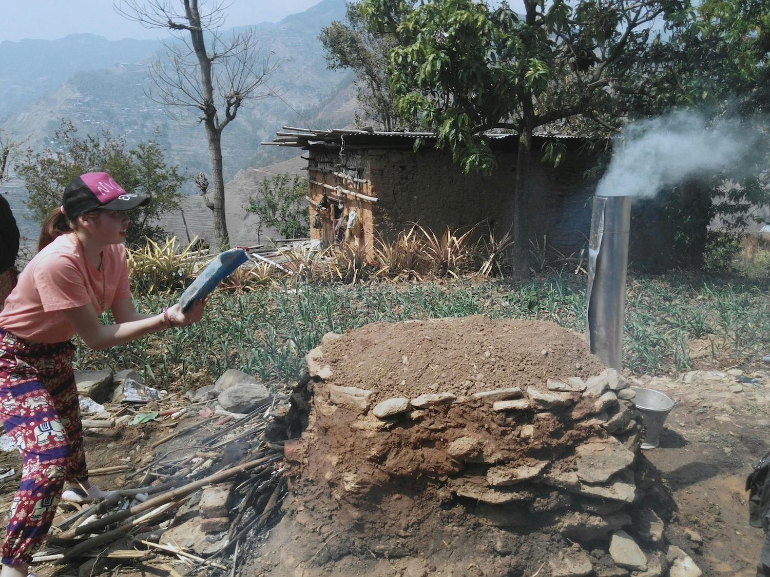 ▲村でかまどを作り炭焼き