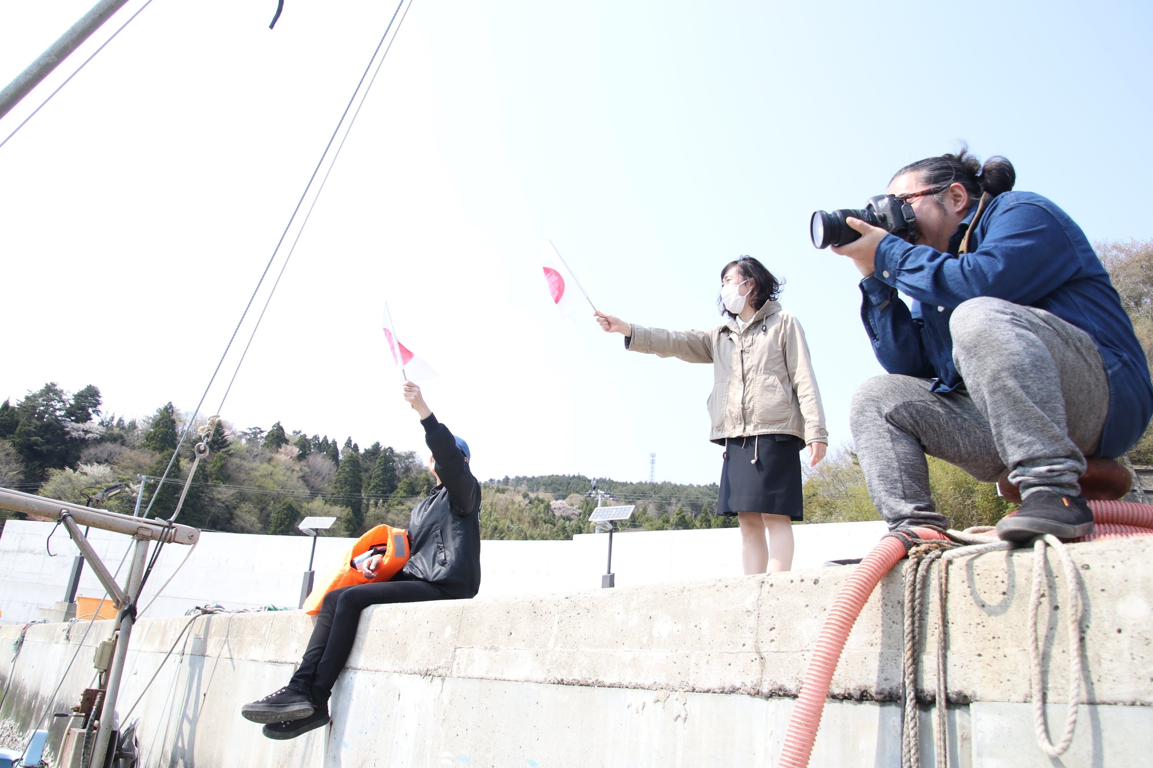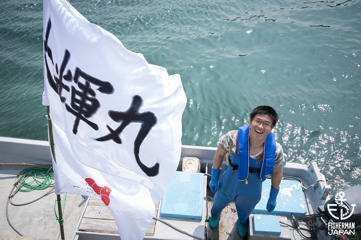 カラフルな大漁旗はありませんが、雄勝の青い海や山によく映えるその白い旗は、漁師になりたいと飛び込んで来た彼の真っさらな気持ちを表しているかのように、眩しく見えました。