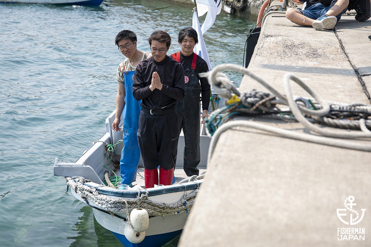 新人漁師である三浦くんも、親方のはじめさんに倣い、見様見真似で供物やお神酒を備え、海の神様に安全と豊漁を祈願しました。