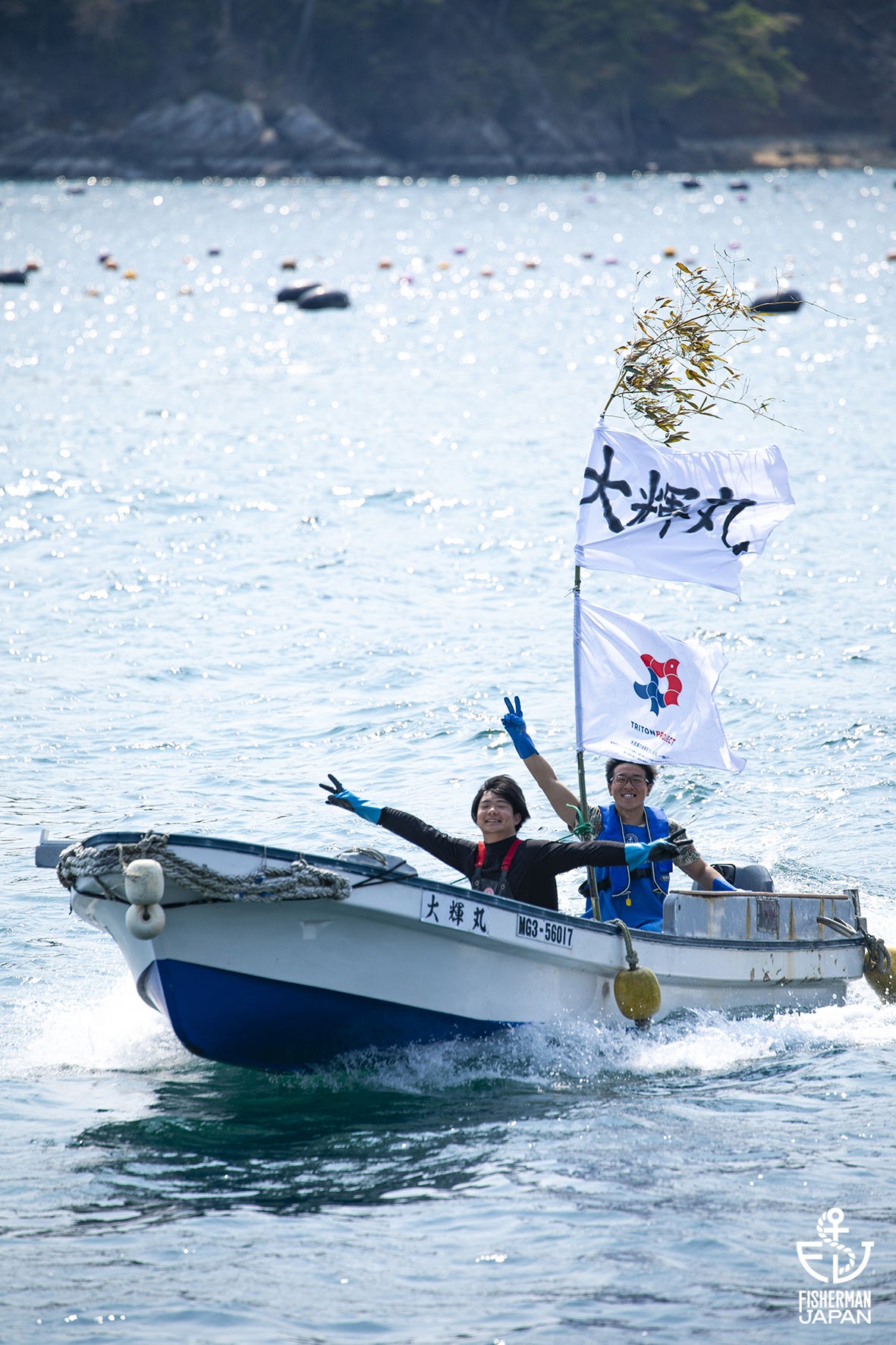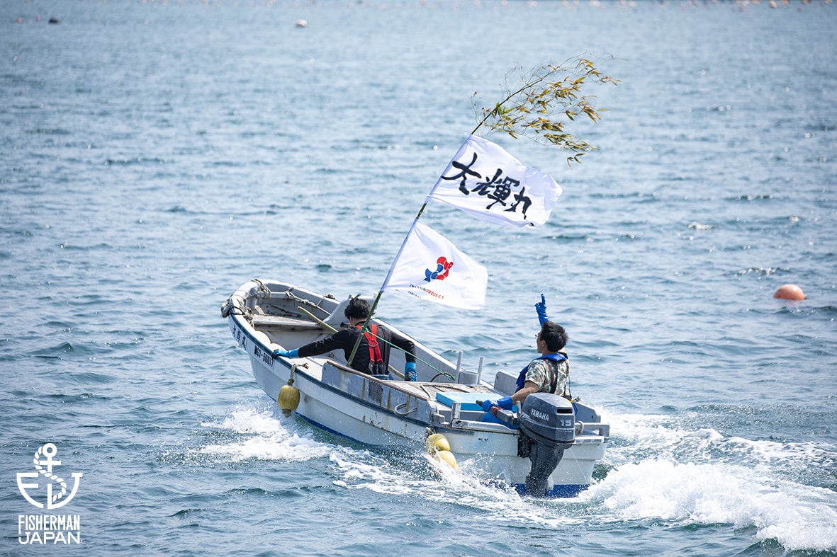 船名が書かれたお手製の旗とTRITON PROJECTの旗を掲げ、「大輝丸」は、いざ海へ。